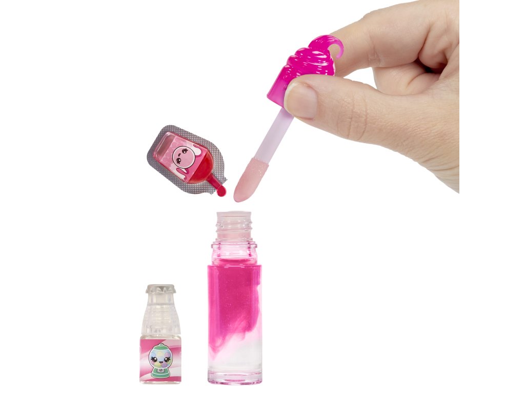 Vyrob si svůj vlastní lesk na rty s roztomilou panenkou. 1. Otevři tubu s leskem na rty. 2. Přidej do tuby vůni z lahvičky na limonádu. 3. Přidej barvu z kelímku na Bubble tea. 4. Tubu s leskem zavři a pořádně ji protřepej. V sérii můžeš vybírat z 6 vůní a vytvořit více než 50 kombinací. Roztomilá voňavá panenka má outfit a boty, které můžeš sundat. Panenku i lesk na rty si můžeš vzít na cesty, stačí spojit s přívěskem na klíče.