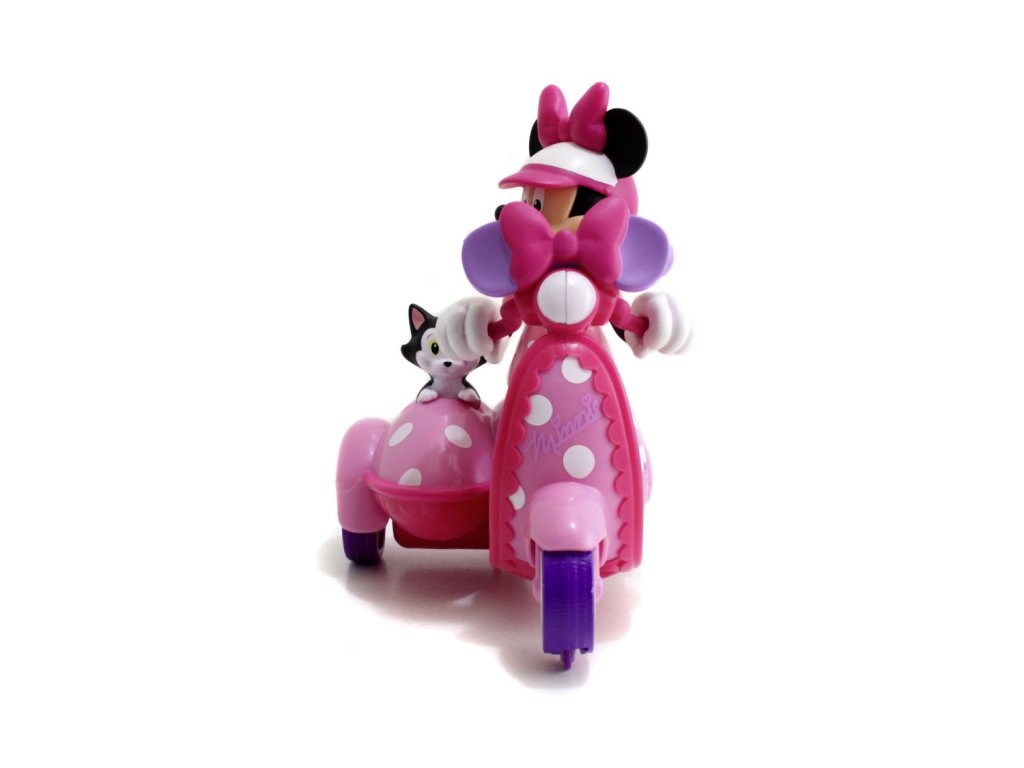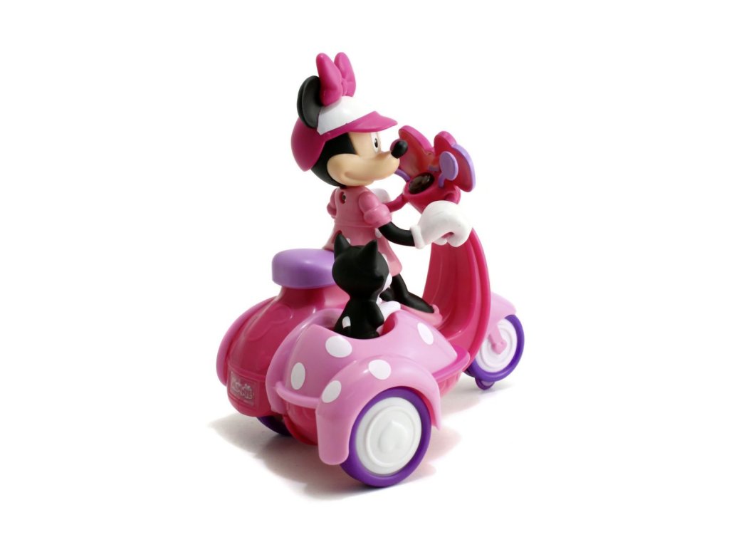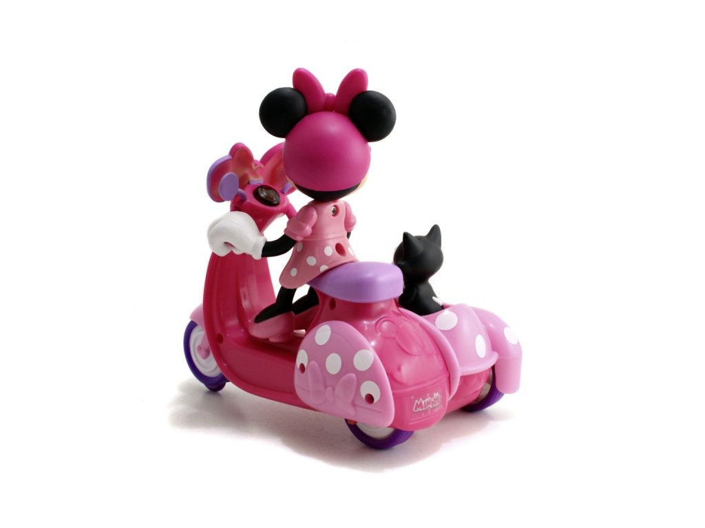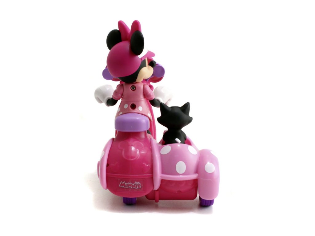 IRC scooter se sajdkárou s figurkou Minnie a kočičkou, 1 kanál, chod vpřed, vzad se zatáčením. Velikost 19 cm. Baterie ovladač 2x 1,5V R03, scooter 3x 1,5V R6, baterie nejsou součástí.