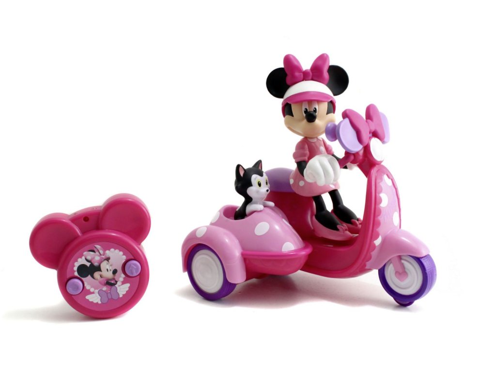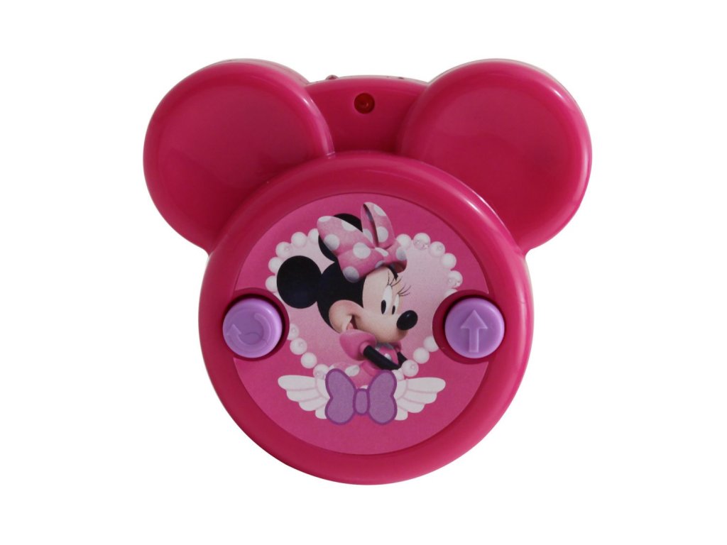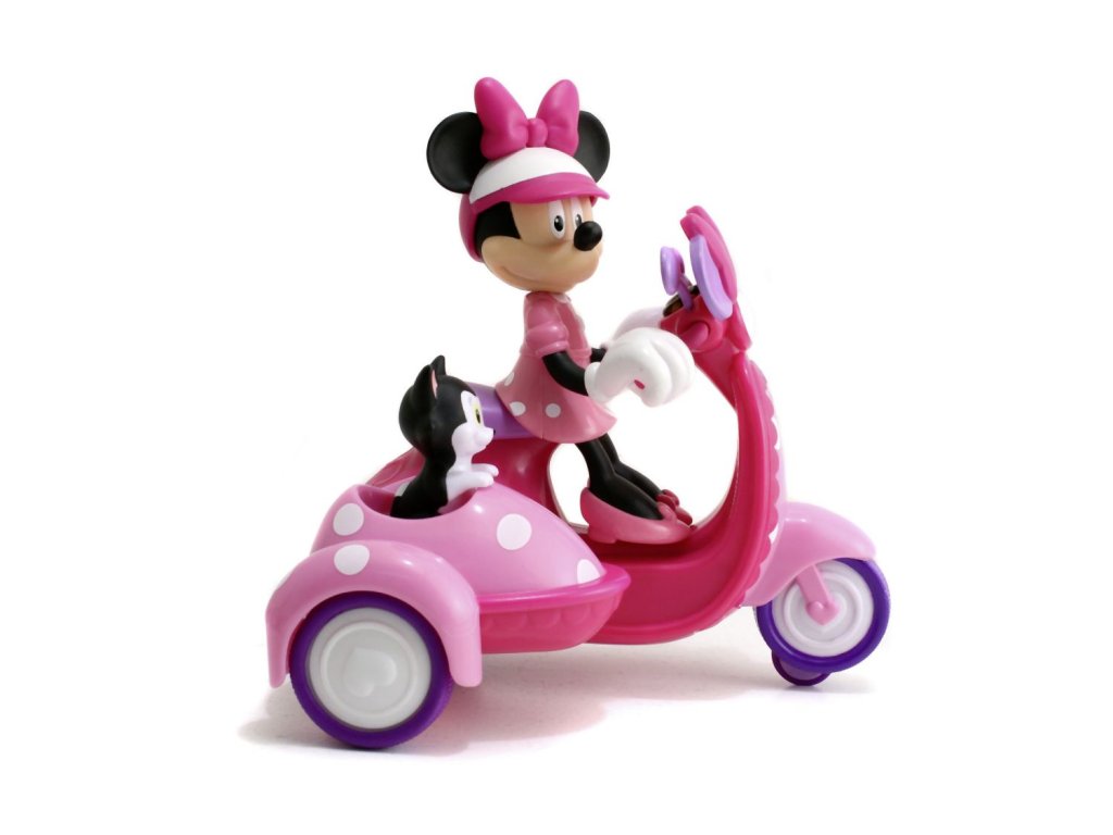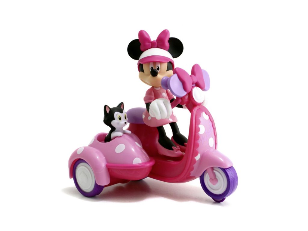 IRC scooter se sajdkárou s figurkou Minnie a kočičkou, 1 kanál, chod vpřed, vzad se zatáčením. Velikost 19 cm. Baterie ovladač 2x 1,5V R03, scooter 3x 1,5V R6, baterie nejsou součástí.