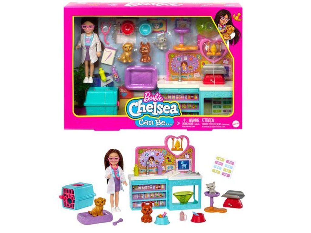 Tmavovlasá panenka Chelsea® si může hrát na veterináře stejně jako její starší sestra Barbie® se sadou Barbie® Chelsea® Veterinářka. Panenka Chelsea® oblečená v roztomilém bílém kabátku a šatech je připravena! Své "pacienty" může vyšetřovat na veterinárním stole s nástěnkou a kontrolovat jejich váhu na pohyblivé váze. Mezi další příběhové kousky pro zábavné hraní patří 4 domácí mazlíčci (2 štěňátka, 1 kočička a 1 ptáček) plus 18 dalších dílů, jako je pelíšek pro mazlíčky, kočičí věž, lékařské nástroje, schránka, kužel, lahvička s pumpičkou, lahvička na léky, přepravka pro domácí mazlíčky, misky na krmení, pamlsky pro pejsky, prostěradlo a další. Panenka neumí stát sama. Barvy a vzhled výrobku se mohou lišit. Pro děti od 3 let.
