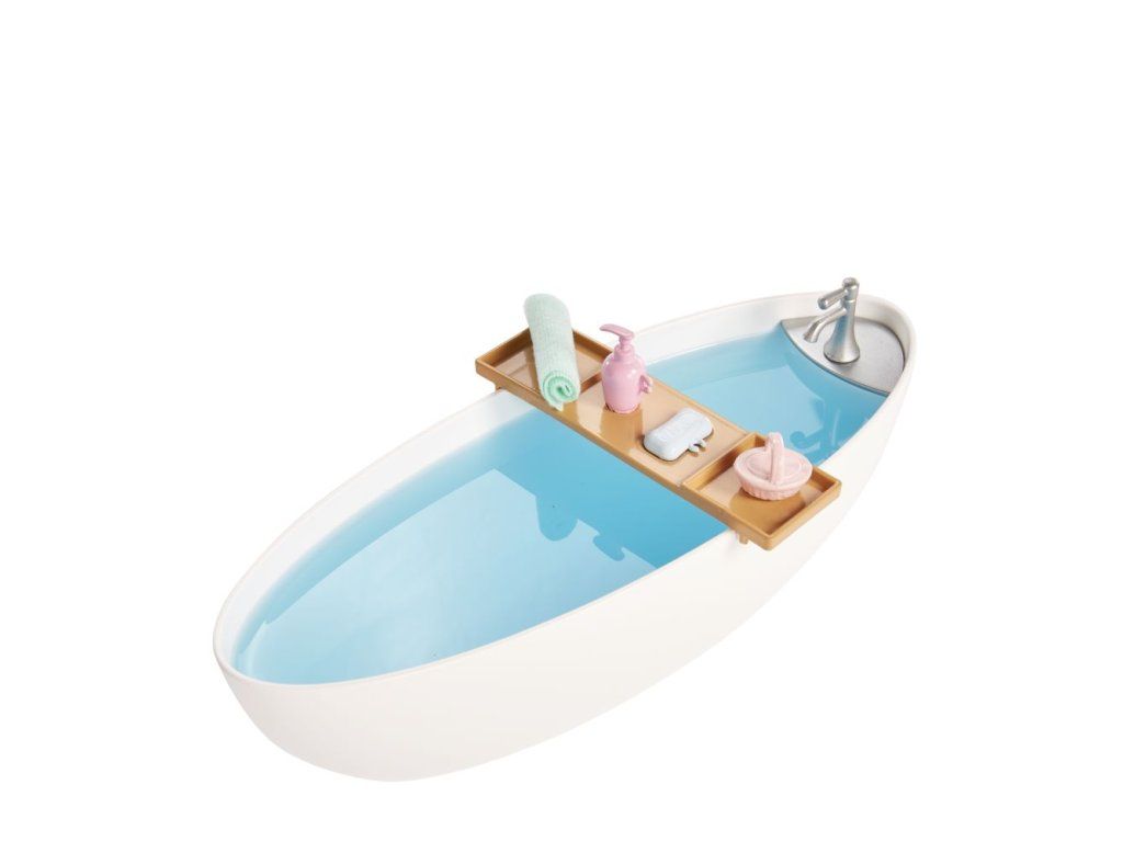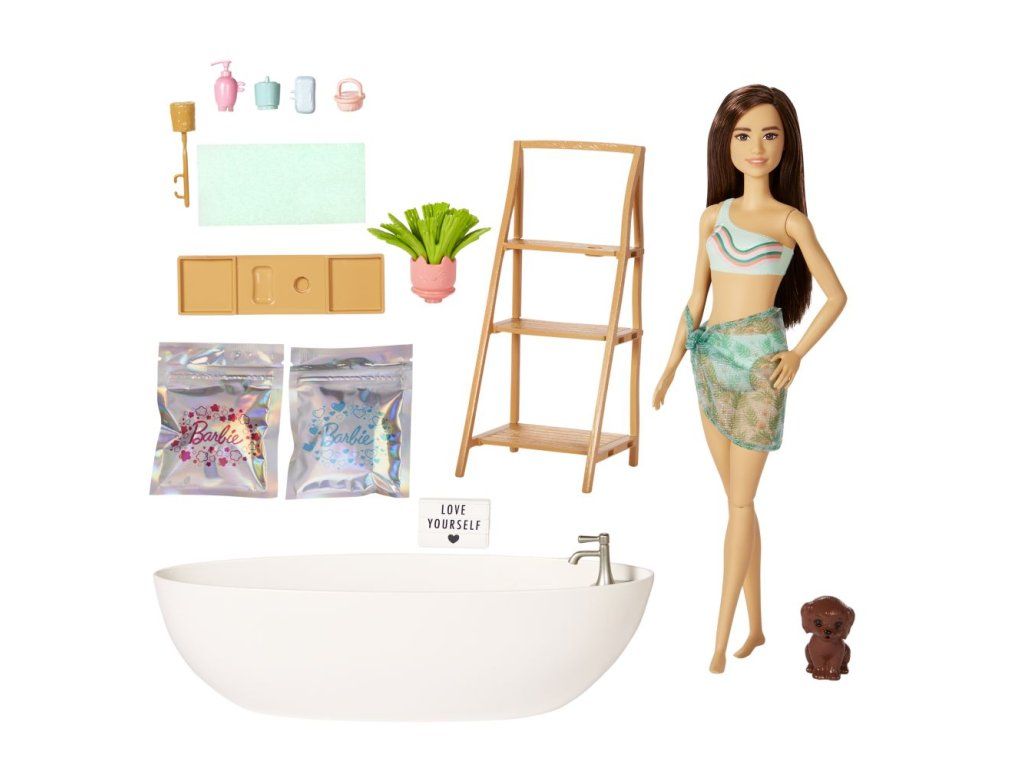Tento herní set Barbie® Panenka a koupel s mýdlovými konfetami s vanou a panenkou Barbie® obsahuje Barbie® panenku oblečenou do plavek s roztomilým sarongem, která je polohovatelná a dodává se se spoustou doplňků, jako jsou vana a podnos, ručník, kartáče, štěňátko a další. Součástí balení jsou dva sáčky konfetového mýdla (růžové a modré), které změní barvu vody ve vaně! Panenka neumí samostatně stát.