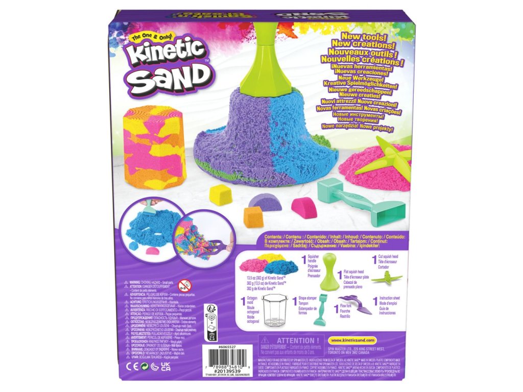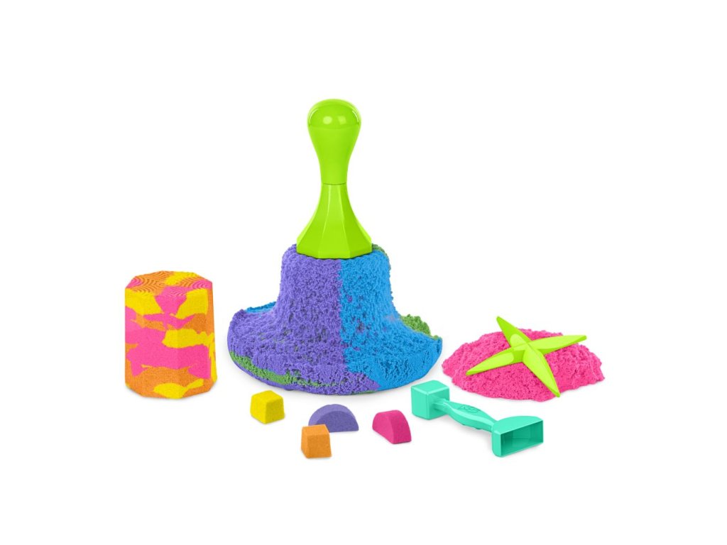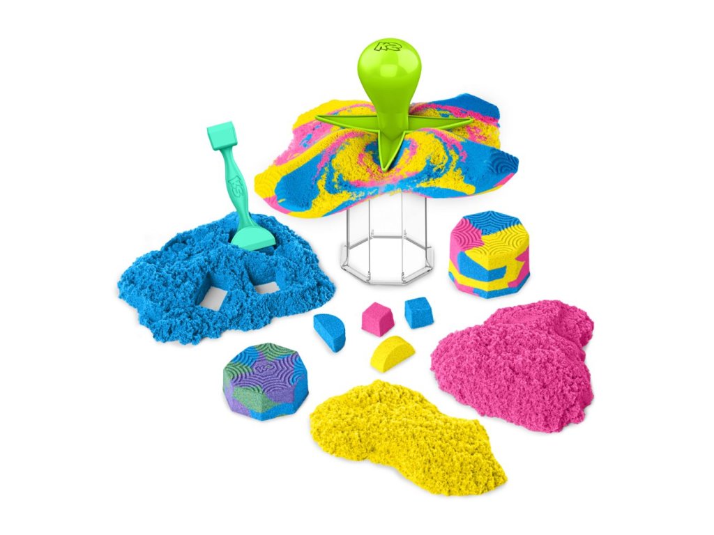 Tato sada obsahuje 130 g žlutého, růžového a modrého kinetického písku, 5 formiček a nástrojů, se kterými můžeš vrstvit, mačkat, krájet a tvořit. Vhodné od 3 let.
