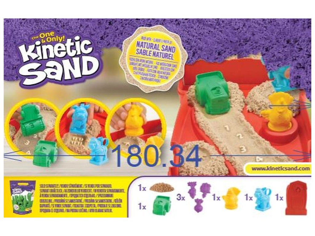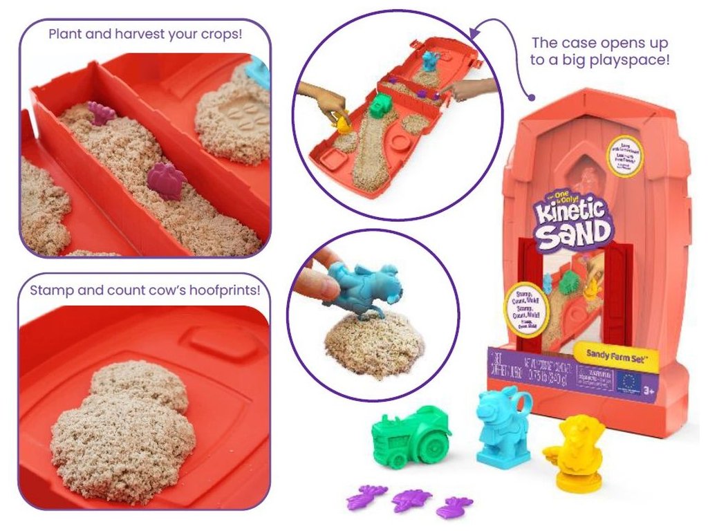 Farma se zvířátky a traktůrkem. Rozložte krabici na hrací podložku. Sada obsahuje figurky několika zvířátek, kterými lze do tekutého písku vytlačovat jejich charakteristické stopy. Také traktur zanechává své stopy.