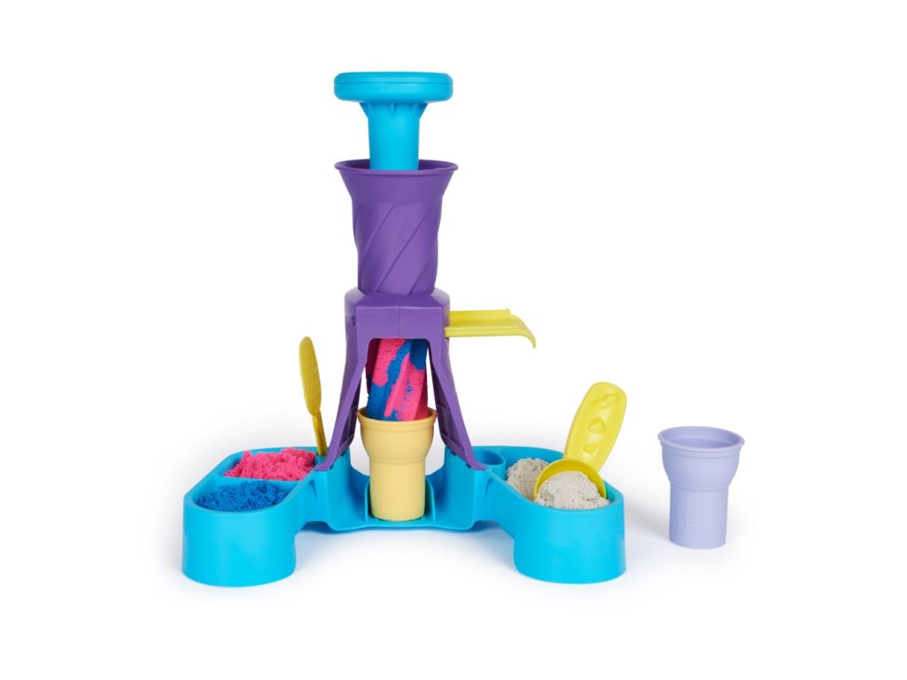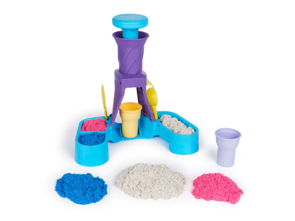 Točte to a tvořte s Kinetic Sand Zmrzlinárna! Poprvé mohou děti kroužit s kinetickým pískem a simulovat tak zážitek jemné zmrzliny, jakou viděly ve skutečném světě! Díky 396 g modrého, růžového a bílého kinetického písku, dvěma kornoutky a nástroji, jako je lopatka s formičkami na sladkosti a struhadlem na posyp, může vaše dítě servírovat nekonečné množství zmrzliny. Nabírejte klasické kornouty nebo špičkově natočte zmrzlinu. Nasypte písek do stanice, stlačte jej a natočte kinetický písek do kornoutu a vytáhněte jej a ozdobte! Přidejte trochu posypu a polevy navíc, pak rozmáčkněte a tvořte znovu! Tento jedinečný kinetický písek je vyroben z přírodního písku, který se lepí k sobě pro snadný úklid! Nikdy nevyschne. Nechte ho protékat vašima rukama –? je to tak uspokojující, že ho nebudete moci odložit! Kinetický písek je skvělou alternativou k modelovací hmotě a je vítaným doplňkem k tvořivé dílně, smyslovým hrám, dětským aktivitám a Montessori hračkám. Kinetická písek podporuje jemnou motoriku a kreativitu prostřednictvím nezávislé hmatové hry. Přineste si zmrzlinovou zábavu domů s Kinetic Sand Zmrzlinárnou!