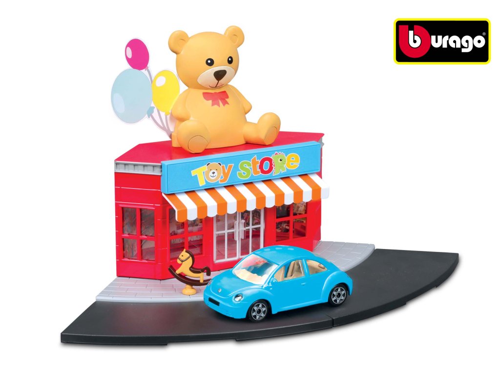 Hračkířství obsahuje kromě plastové budovy s pohyblivými dveřmi také pouliční a chodníkový komponent a různé doplňky.