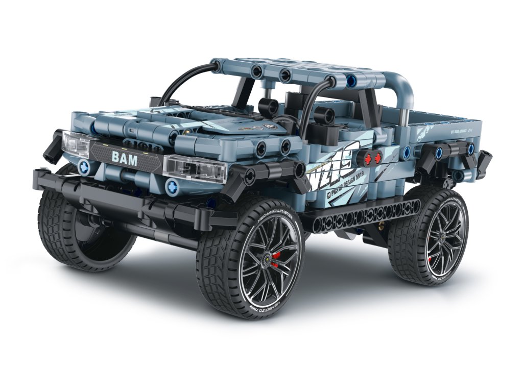 iM.Master Stavebnice auto s korbou. Rozměry 23,2x11x10,2 cm. 463 dílků. Na zpětné natažení. Otevírací dveře, fungující zadní tlumiče.