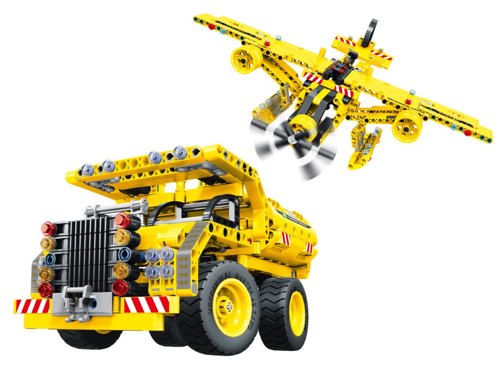 Stavebnice Nákladní auto sklápěč a letadlo 2v1. Velikost nákladního auta 22x11x12cm, velikost letadla 37x25x13 cm. Lze sestavit z jedné sady nákladní auto nebo letadlo.