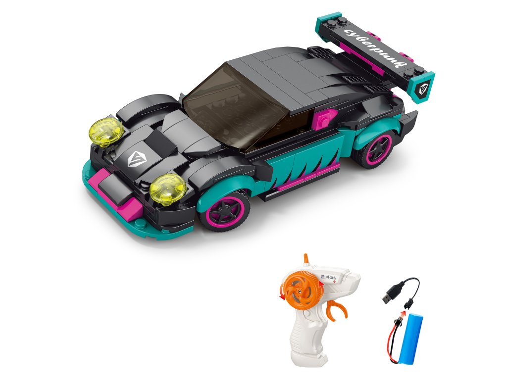 Stavebnice Auto tyrkysové RC na dálkové ovládání. 265 dílků. Rozměry 17,3x7,6x5 cm. Pistolový ovladač. Frekvence 2.4GHz. Bateriový pack 3.7V 350mAh Li-ion do auta součástí, 2xAA do ovladače nejsou součástí. USB kabel součástí. Přepínač ON/OFF na spodní straně auta a na boční straně ovladače. Obrázkový návod bez textu a nálepky součástí.