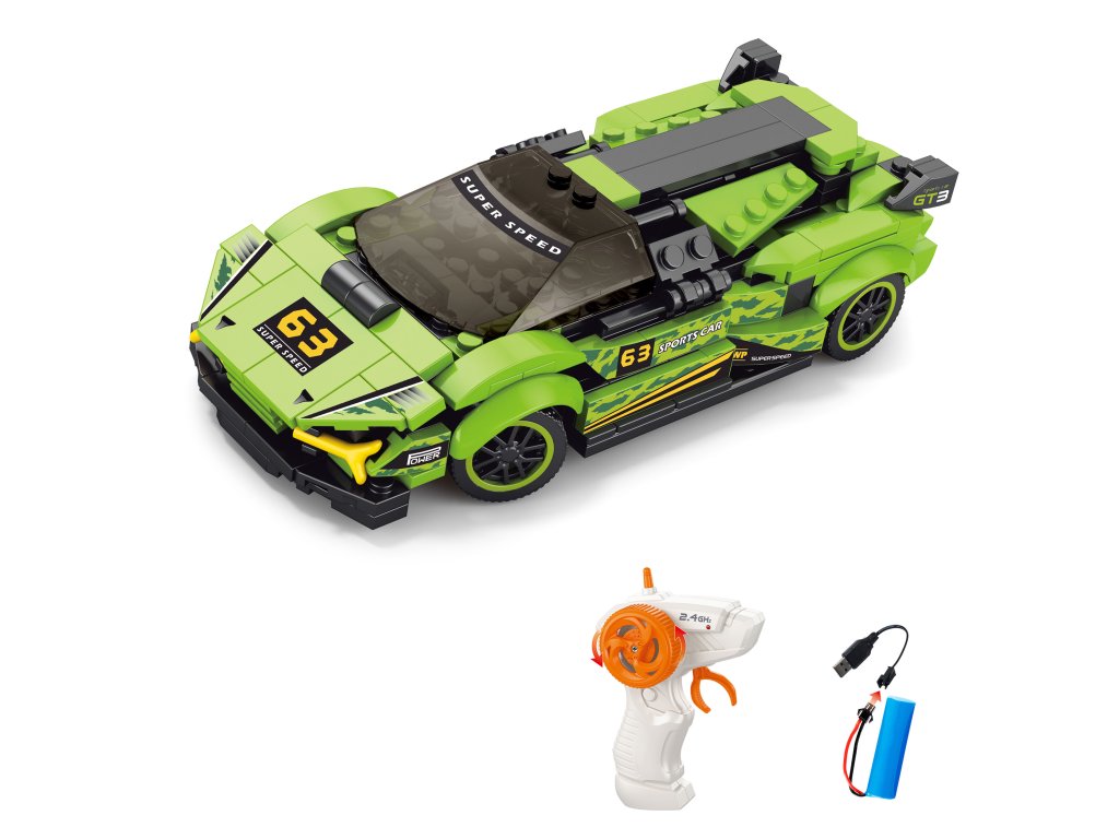 Stavebnice Auto zelené RC na dálkové ovládání. 275 dílků. Rozměry 17,2x7,2x4,5 cm. Pistolový ovladač. Frekvence 2.4GHz. Bateriový pack 3.7V 350mAh Li-ion do auta součástí, 2xAA do ovladače nejsou součástí. USB kabel součástí. Přepínač ON/OFF na spodní straně auta a na boční straně ovladače. Obrázkový návod bez textu a nálepky součástí.