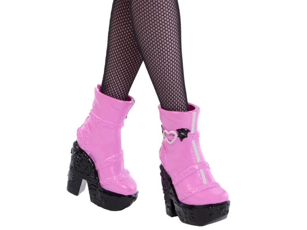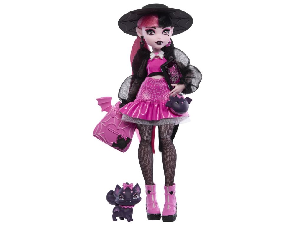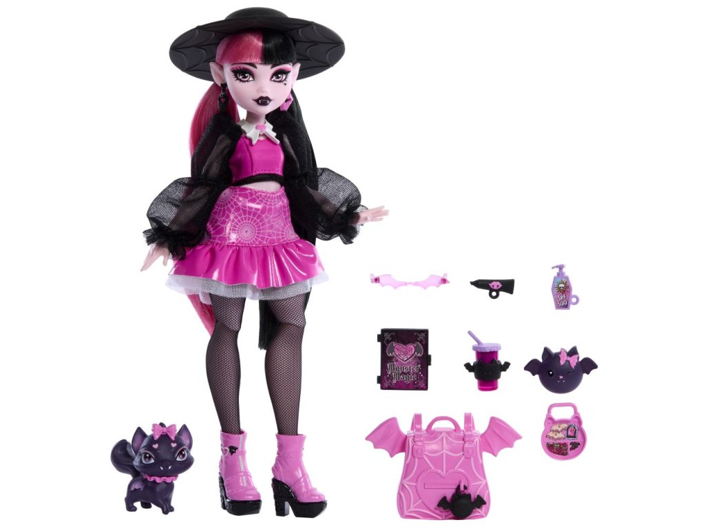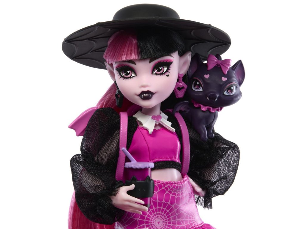 Příšerka monsterka Draculaura™ z Monster High™ je v rozkošném růžovo-černém provedení od hlavy až k patě opravdu elegantní upírka. Je dodávána se svým mazlíčkem Count Fabulous™ v podobě kočky a 6 doplňky pro vyprávění příběhů, jako jsou například batoh, kniha a svačinka!