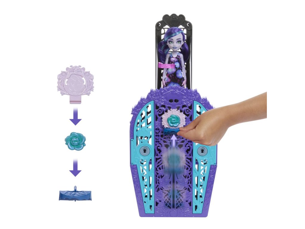 Vyřešte záhadu, odemkněte brány Monster High™ a odhalte panenku z kolekce Skulltimate Secrets: Záhadná zahrada! Děti si mohou hrát na strašidelné detektivy a hledat stopy na mapě pomocí "kouzelného" klíče s lupou. Cestou objeví více než 19 překvapení a zažijí děsivě zábavný zážitek při rozbalování! Každá panenka se prodává samostatně v závislosti dostupnosti.