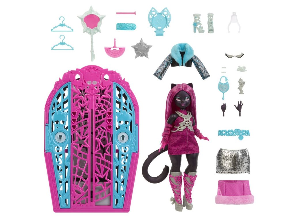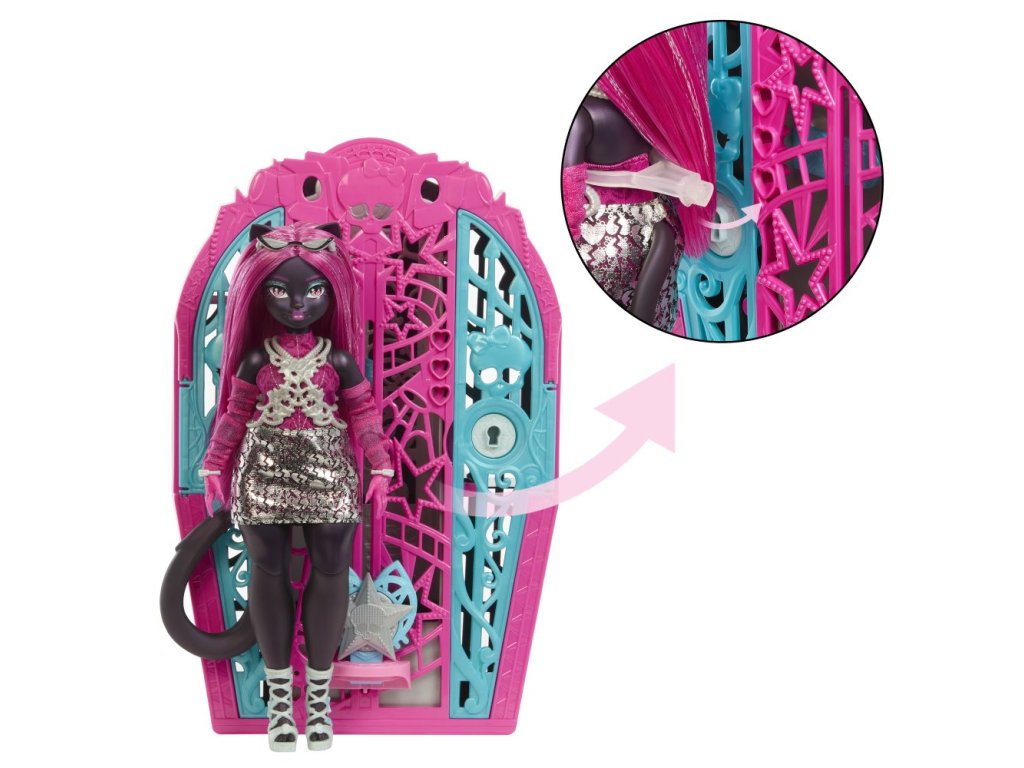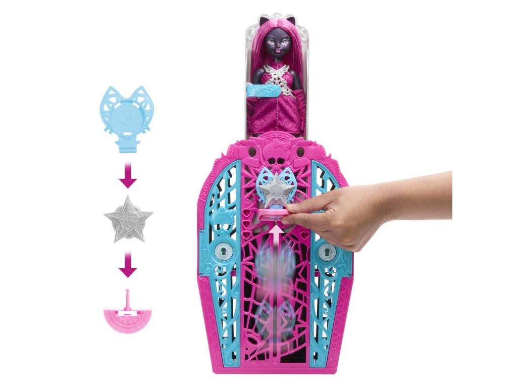 Odhalte tajemství Hauntlywoodu s Monster High! Vyřešte záhadu, otevřete brány Hauntlywoodu a odhalte kloubovou panenku Monster High. Děti se mohou stát strašidelnými detektivy a hledat stopy na mapě pomocí „kouzelného“ zvětšovacího klíče. Po cestě je čeká více než 19 úžasných překvapení, včetně třpytivých oblečků, děsivých rukavic a oslnivého šperku. Po skončení hraní si děti mohou uklidit monsterku, oblečení a doplňky do hvězdného šatníku, který je ideální nejen pro ukládání, ale i pro vyprávění příběhů. Každá panenka se prodává samostatně v závislosti na dostupnosti. Panenky neumí samostatně stát. Barvy a vzhled výrobku se mohou lišit.