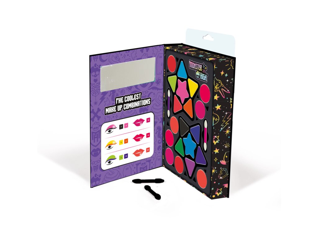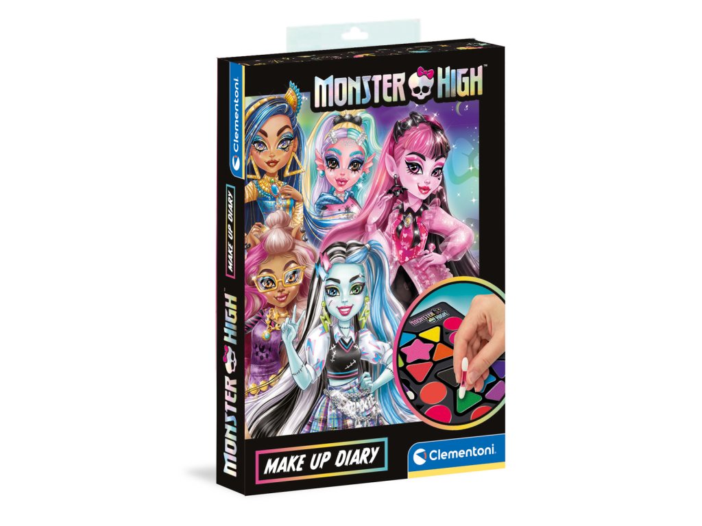 Skládací pouzdro na make-up obsahující oční stíny a rtěnky pro vytvoření speciálního make-upu. Diář je dokonalým doplňkem pro zábavu s postavičkami Monster High. Make-upy byly testovány pro děti, aby si s nimi mohly hrát zcela bezpečně a lze je snadno odstranit vodou. Rozměr balení: 23,5x13,5x33 cm. Věk 6+