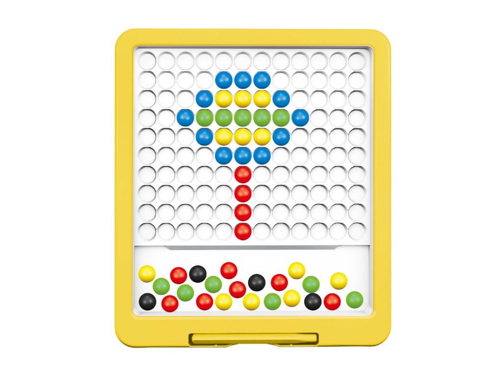 Veselá mozaika, kde se kuličky přesouvají pomocí magnetické tužky. Dítě může vytvářet obrázky dle vlastní fantazie nebo dle přiložených vzorů.
