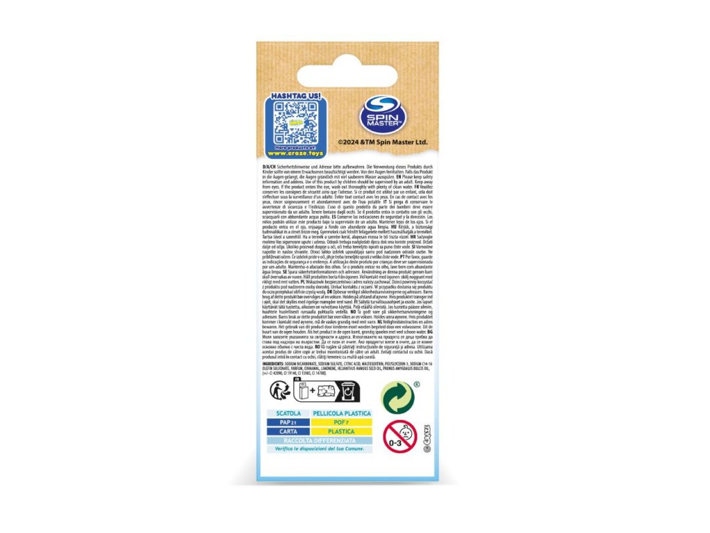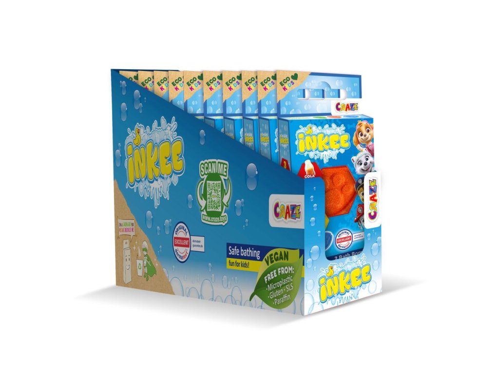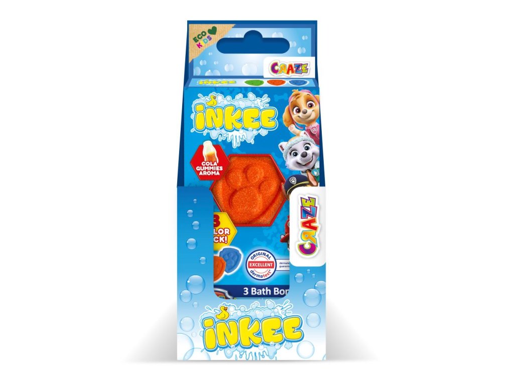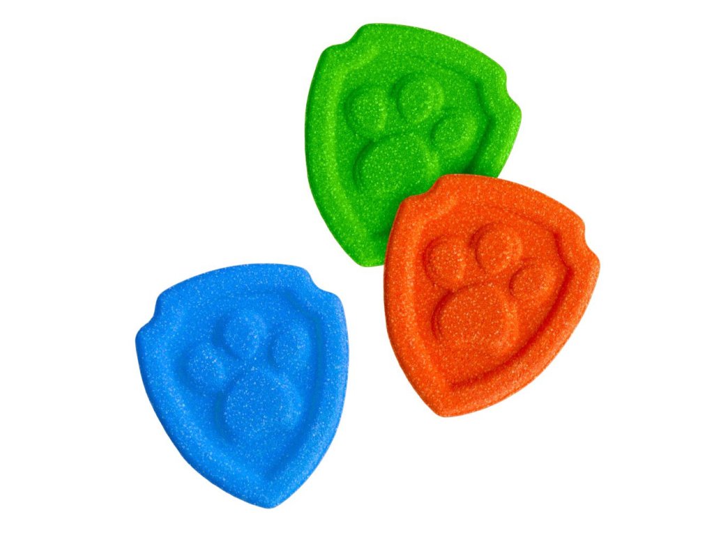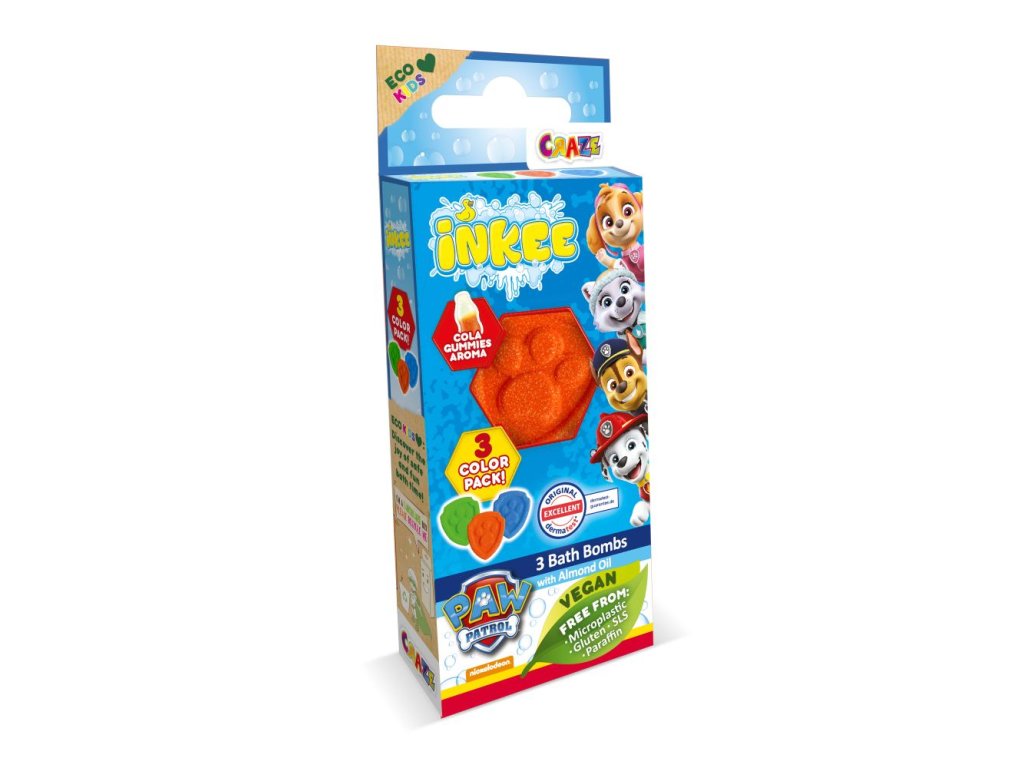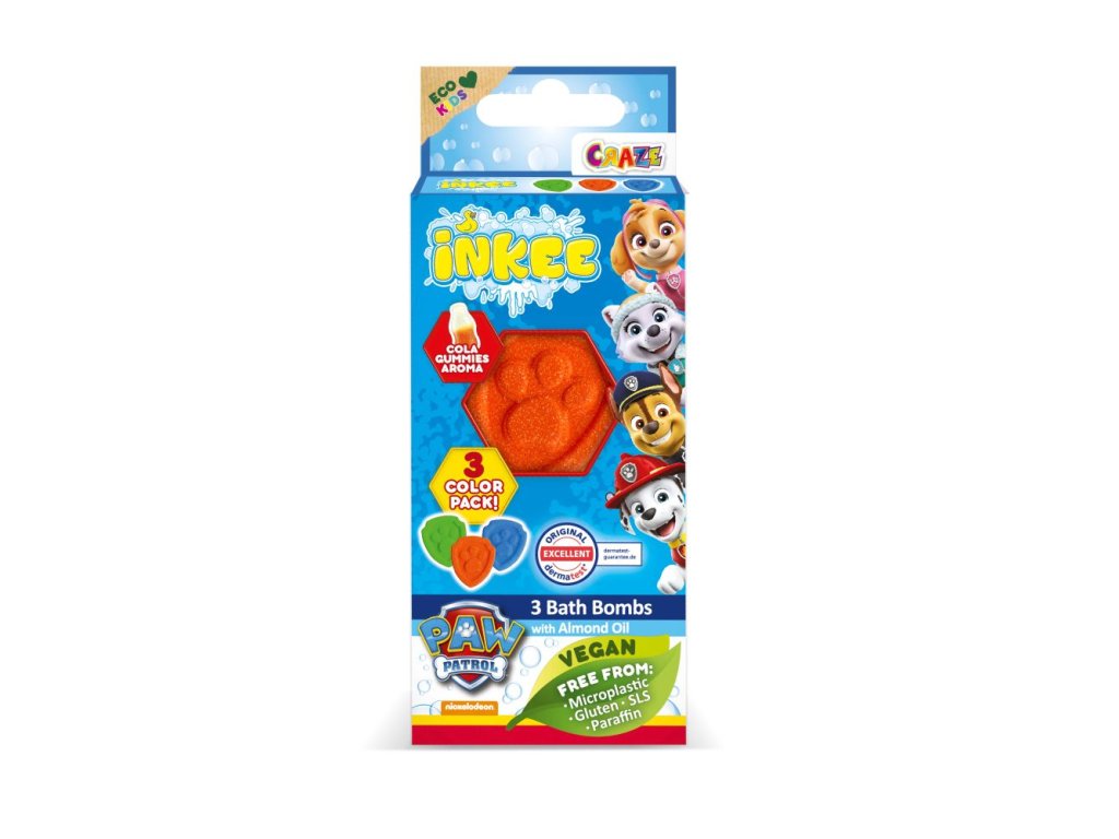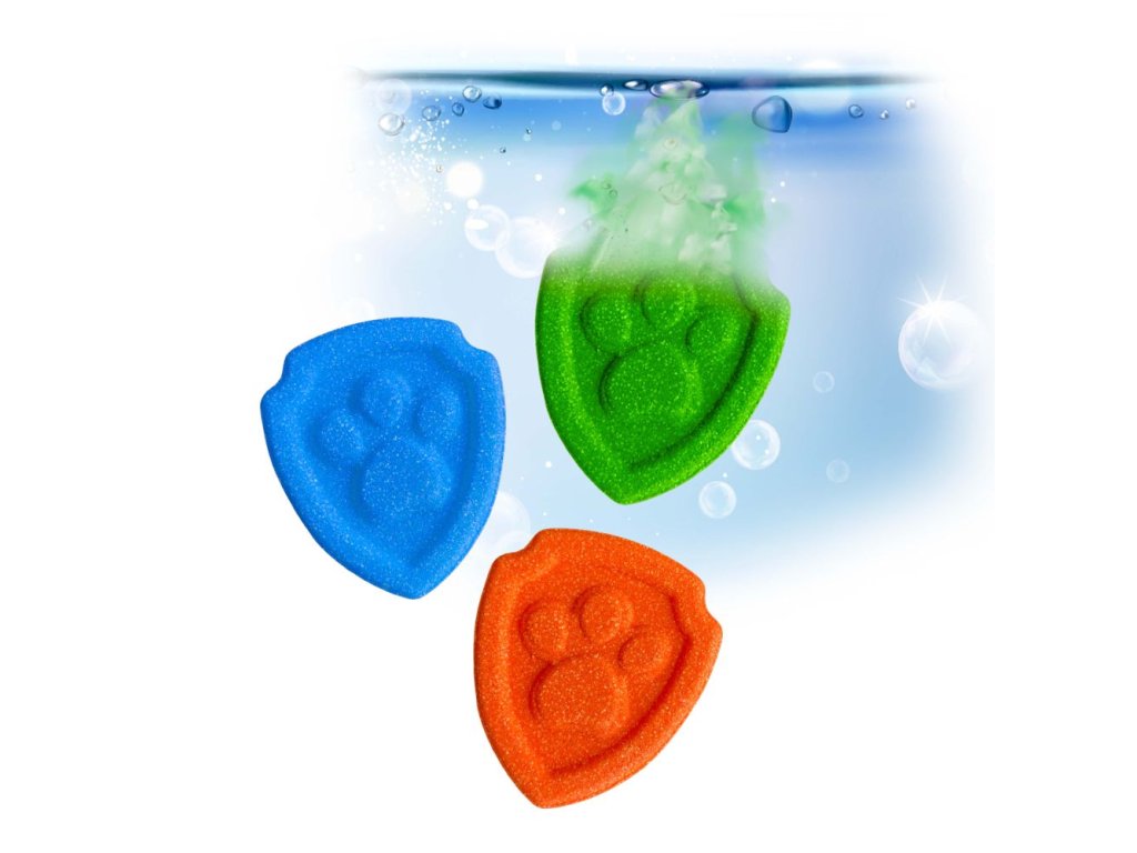 Balení bomb do koupele (3 x 15 g) s tvarem odznaku Paw Patrol a 3 různými barvami (modrá, oranžová a zelená). S mandlovým olejem a vůní Cola Gummies. Display 10ks.