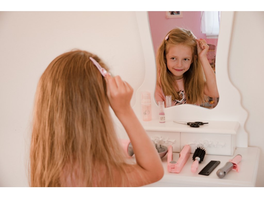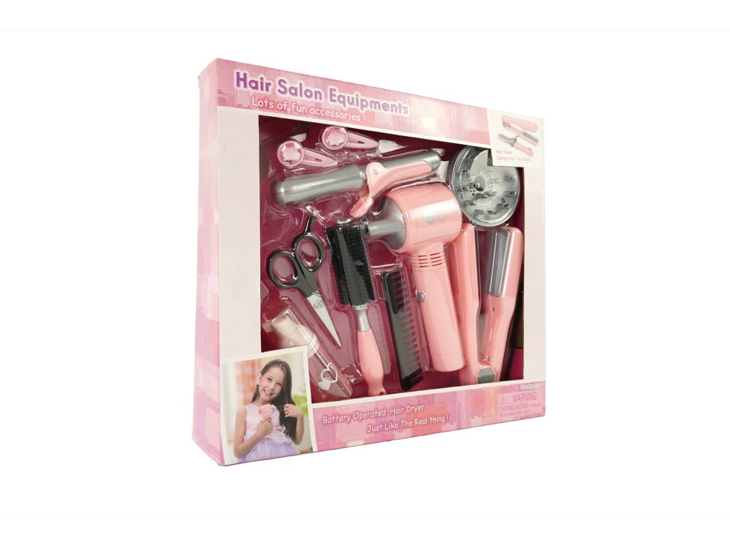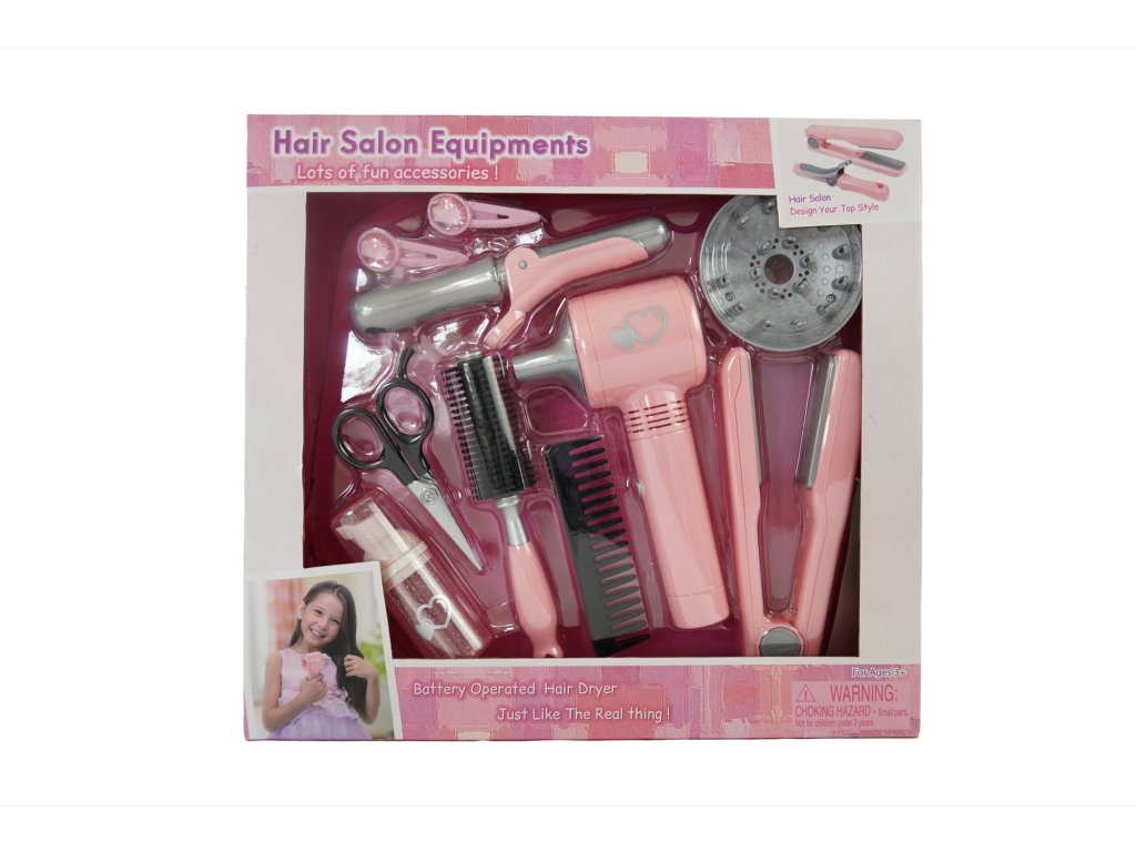 Sada pro kadeřnice v trendové šedo-růžové barvě obsahuje kulmu, fén na baterie s difuzérem, nůžky, hřebínek, kartáč, žehličku na vlasy, sponky, sprej na vlasy.