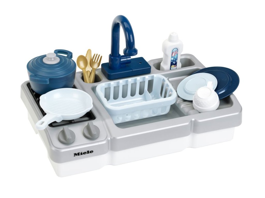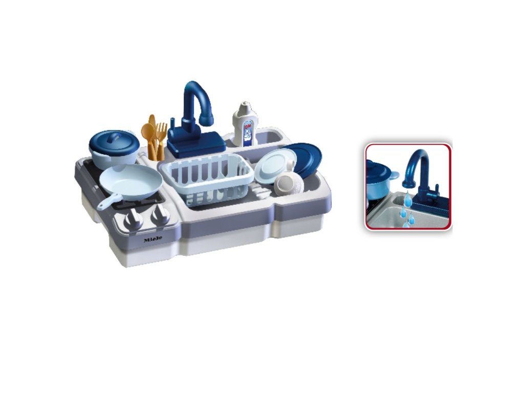 Plastový dřez s nádobím a reálnou funkcí tekoucí vody z kohoutku. Vhodné pro děti od 3 let.