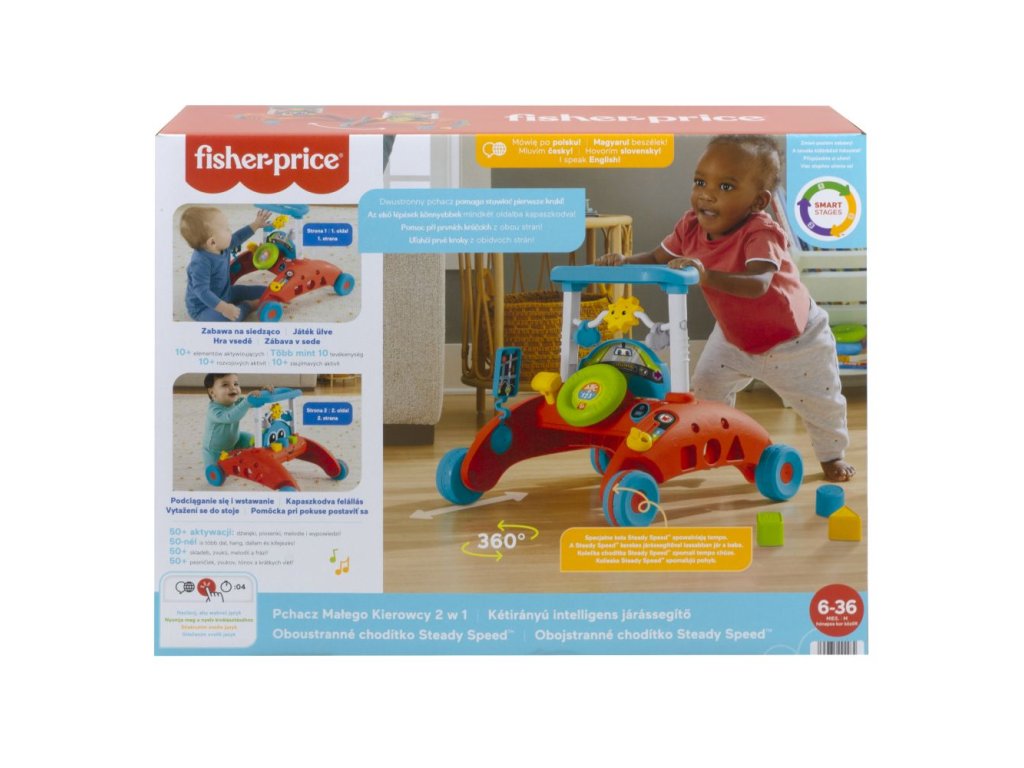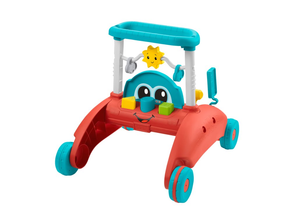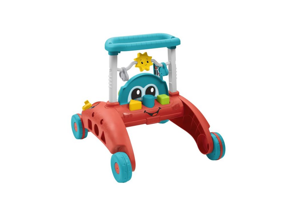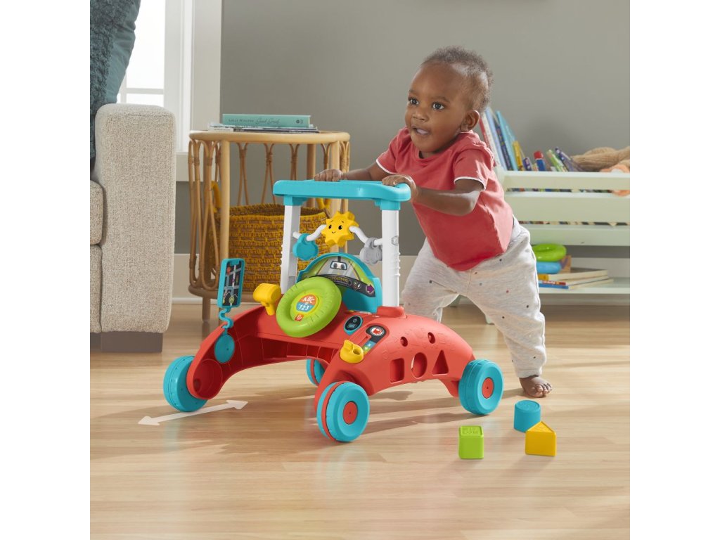 Oboustranné chodítko od Fisher-Price® roste spolu s dítětem a nabízí tři režimy hry. V prvním režimu jsou aktivity pro hru v sedě, kdy může dítě ovládat palubní desku "řidiče" s volantem, svítícím klaksonem, řadicí pákou a tlačítkem ABC/123, které aktivuje světla a zvuky. Chodítko dále obsahuje 3 barevné tvary k třídění, posuvník, klapky a další. V druhém režimu se malý neposeda může chytit za rukojeť na stabilní základně a vytáhnout se pomocí chodítka do stoje (z obou stran!). V třetím režimu pak chodítko, přístupné z obou stran, odměňuje první krůčky dítěte světýlky, písničkami, zvuky a frázemi. Chodítko má kolečka s regulací rychlosti, která pomáhají malým chodcům ustálit jejich první krůčky. Protože se každé dítě vyvíjí jinak rychle, podporuje hračka technologii Smart Stages™, díky níž můžete zvolit takovou úroveň obsahu, která je pro vaše děťátko zrovna nejvhodnější. Vybrat můžete mezi třemi úrovněmi výukového obsahu, který přináší více než 100 zvuků, melodií a frází a učí děti abecedu, čísla, počítání, protiklady a další!