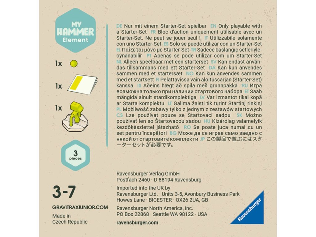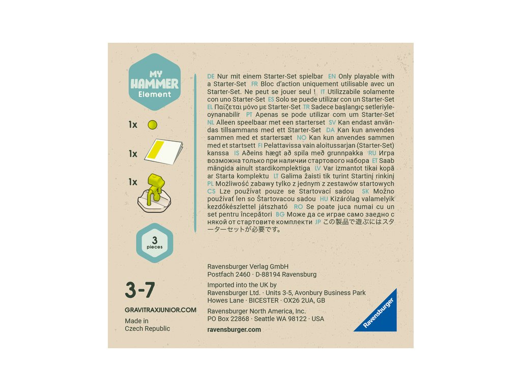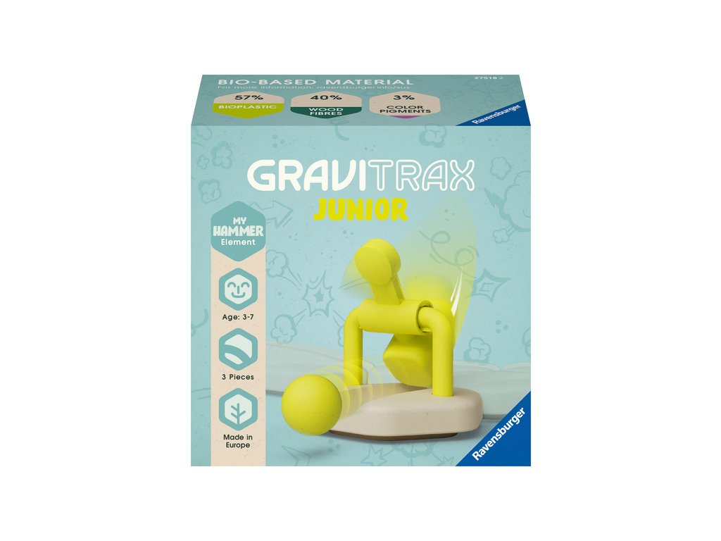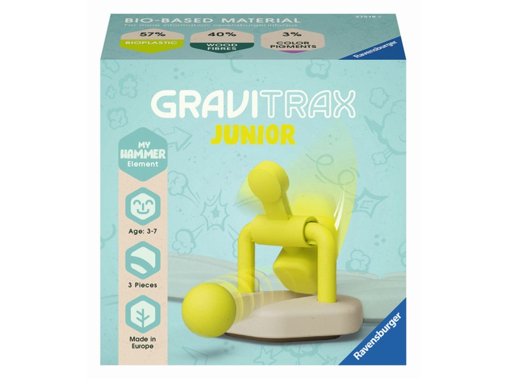 GraviTrax Junior je interaktivní systém kuličkové dráhy pro děti od 3 let. Ti nejmenší si staví své vlastní světy z kuličkových drah, které lze podle libosti zdobit a vytvářet tak jednotlivé tematické světy. Děti si tak při kreativním stavění užijí mnoho zábavy. Chlapci a dívky si mohou stavět své vlastní světy z kuličkových drah, které lze dle libosti zdobit a vytvářet tak jednotlivé tematické světy. Stejně jako všechny ostatní součásti systému interaktivní kuličkové dráhy je doplněk Kladivo vyroben z dřevěného bioplastu. Kladivo přináší na dráhu ještě větší dynamiku, takže lze postavit ještě napínavější průběh dráhy – pro nikdy nekončící zábavu.