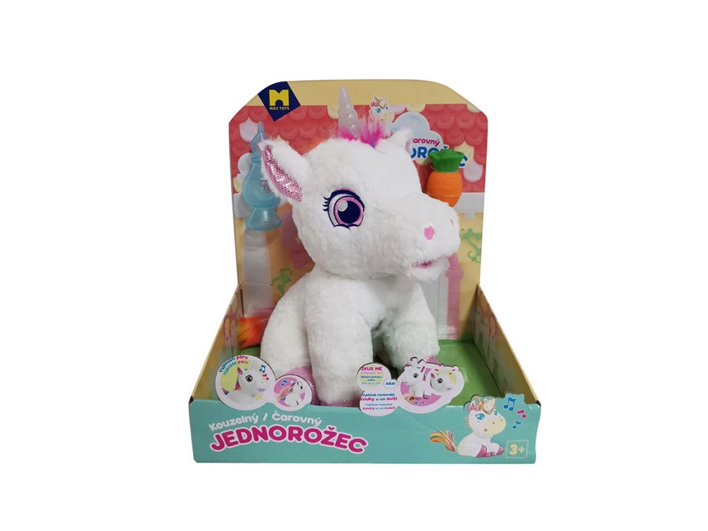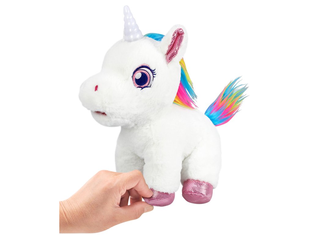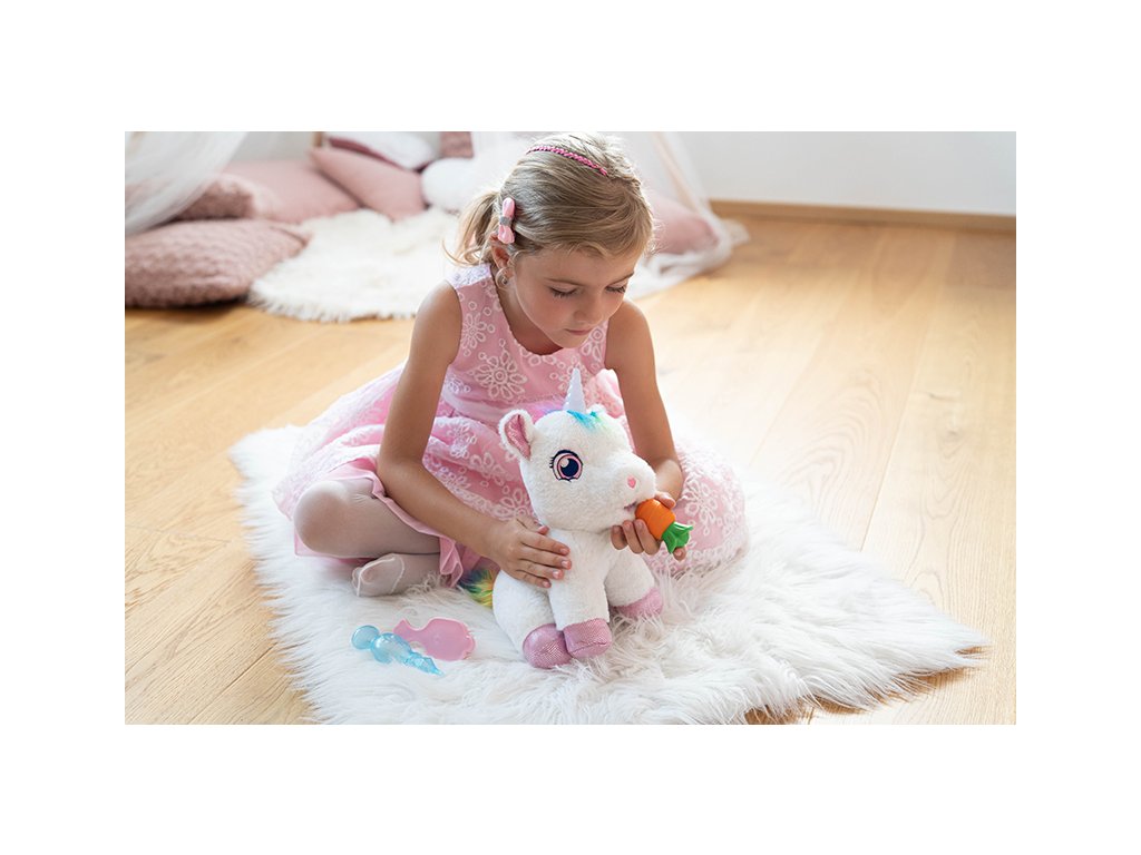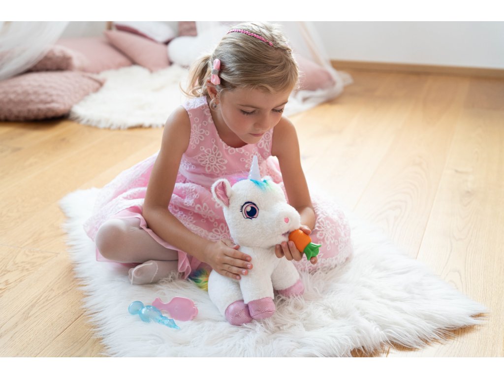 Interaktivní jednorožec, který vydává roztomilé zvuky, při pohlazení po zádech chrlí páru z pusinky a spokojene vrní a svítí mu roh různými barvami, které se mění.