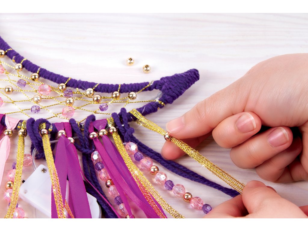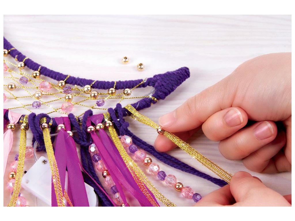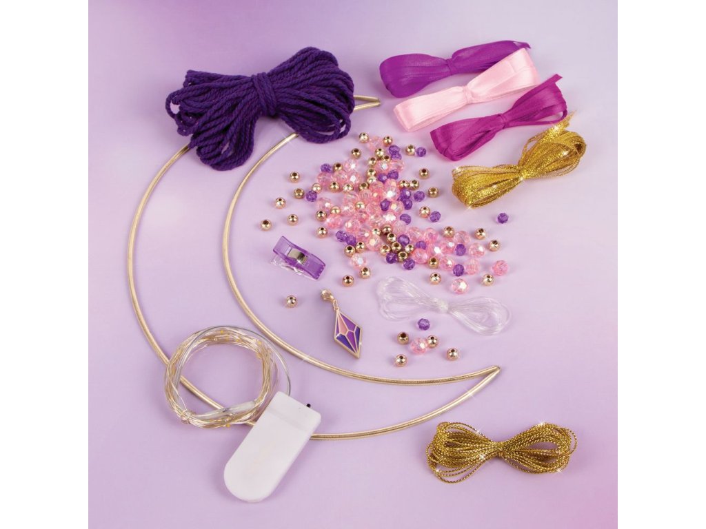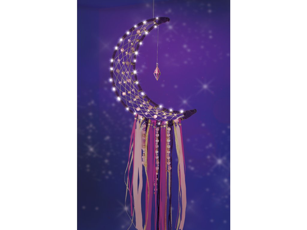 Balení obsahuje konstrukci ve tvaru měsíce, barevné korálky, stříbrnou šňůru, barevné provázky, peříčka na dekoraci, světýlka a instrukce. Vhodné od 8 let.