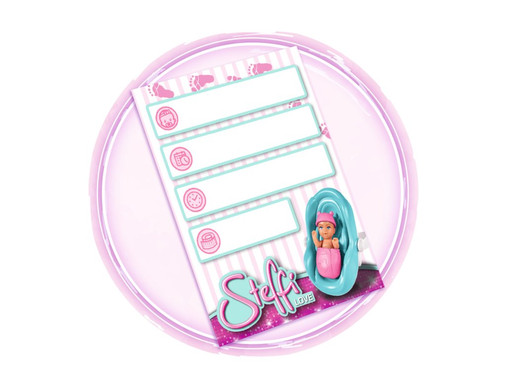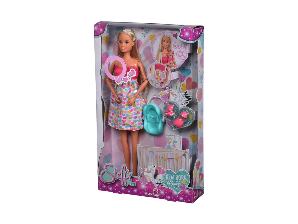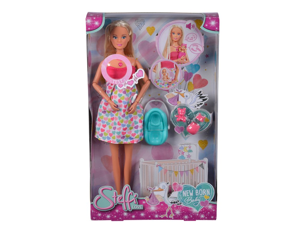 Steffi jako nastávající maminka s miminkem v bříšku. Když stiskneme tlačítko ve tvaru srdce na jejím náhrdelníku, uslyšíme tlukot srdce miminka. Když se dítě narodí a vykoukne z bříška, dá o sobě vědět křikem. Když pak znovu stiskneme srdíčko na náhrdelníku, postupně uslyšíme další zvuky - pláč, usínání při ukolébavce a smích. Sada obsahuje také rodný list k vyplnění, čepičku a zavinovačku pro novorozence, hračku medvídka a dětské nosítko. Panenka Steffi má ohebné klouby na loktech a zápěstích. Velikost panenky 29 cm.