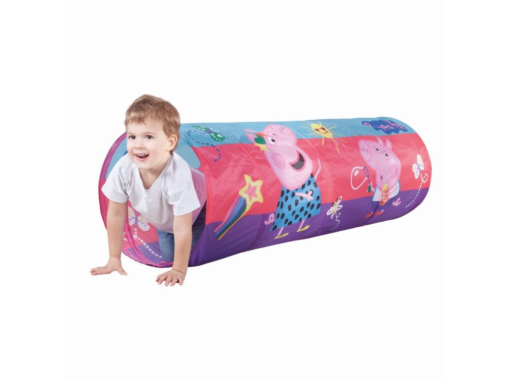 Zábavný lehce složitelný hrací tunel v licenci Prasátka Peppy podporuje dětskou představivost a aktivní hru. Dítě ním může prolézat, plazit se nebo si hrát uvnitř. Skládací tunel lze snadno uschovat a je vhodný pro vnitřní i venkovní použití. Rozměry tunelu jsou 145x50 cm. Vhodné pro děti od 2 let.