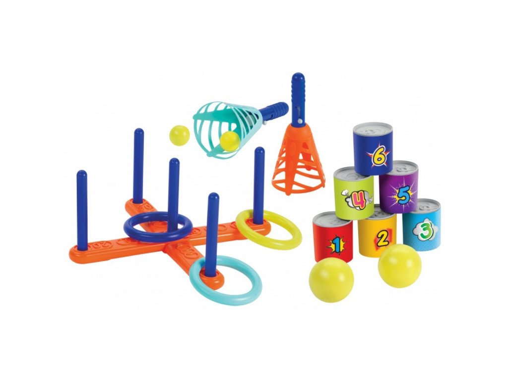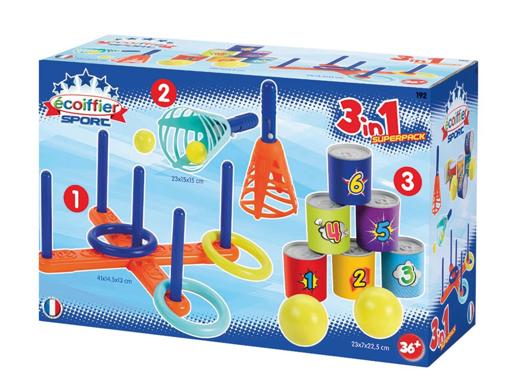 Sada 3 oblíbených her vhodných do interiéru i exteriéru - chyť míček, kroužky na kříž a shazování plechovek. Vše plastové, vyrobeno ve Francii.
