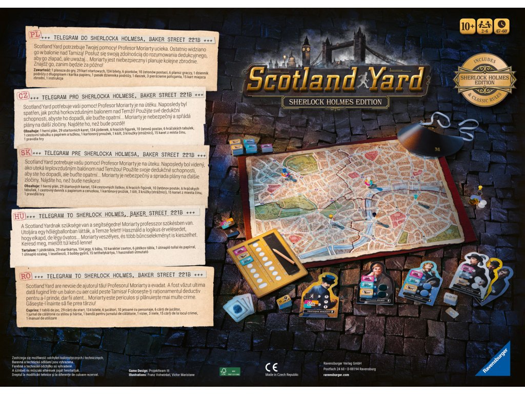 Scotland Yard potřebuje vaši pomoc! Profesor Moriarty je na útěku. Naposledy byl spatřen, jak prchá horkovzdušným balonem nad Temží! Použijte své dedukční schopnosti, abyste ho dopadli, ale buďte opatrní... Moriarty je nebezpečný a spřádá plány na další zločiny. Najděte ho, než bude pozdě! V této verzi hry Scotland Yard pátrá Sherlock Holmes a jeho společníci po zločineckém géniovi, profesoru Moriartym. Můžete si vybrat, jestli budete hrát detektivy, nebo Moriartyho. Hru můžete hrát podle původních pravidel nebo podle speciálních pravidel Sherlocka Holmese.