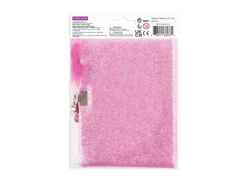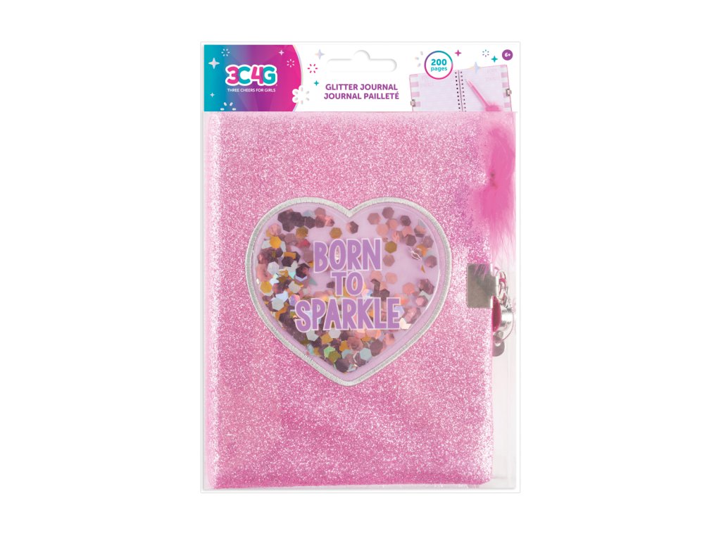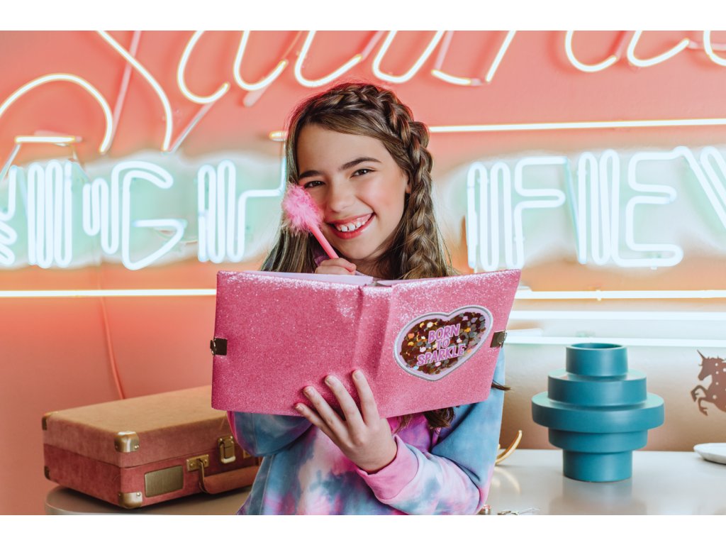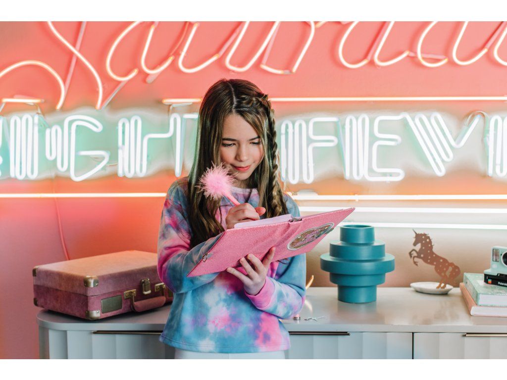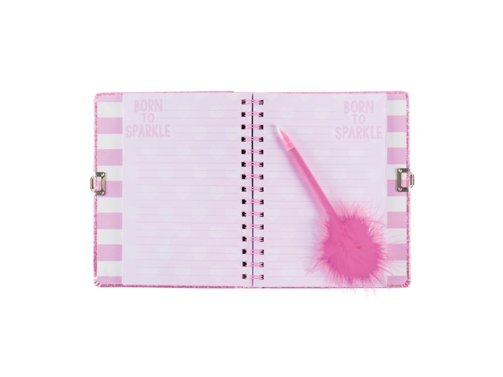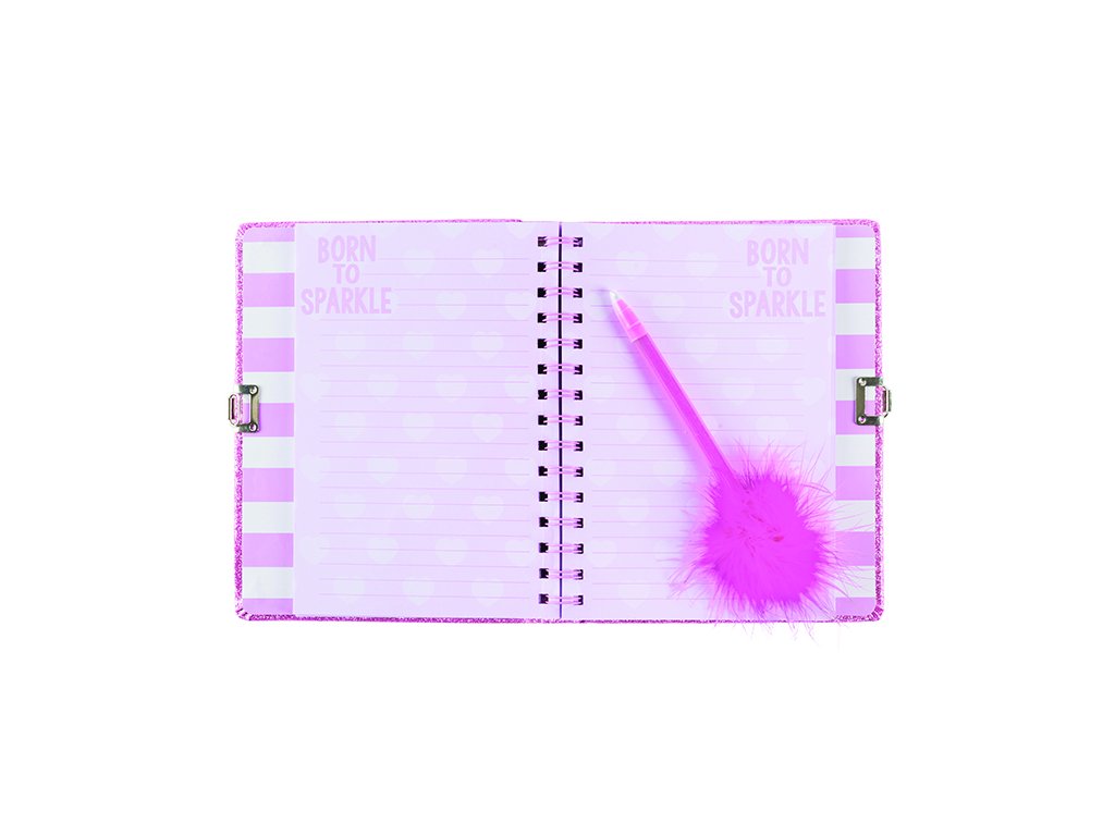 Deník se třpytivými a tvrdými deskami. Obsahuje 160 barevných stránek, pero s pírkem a zámek s klíčky. Vhodné od 6 let.