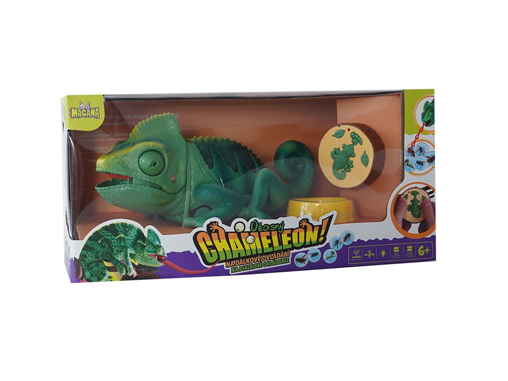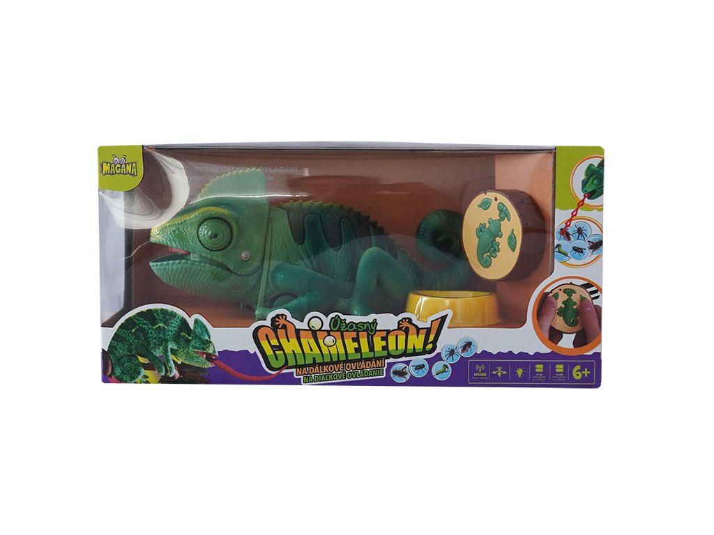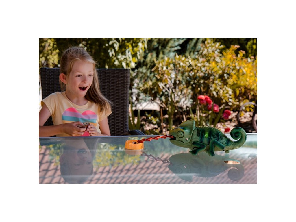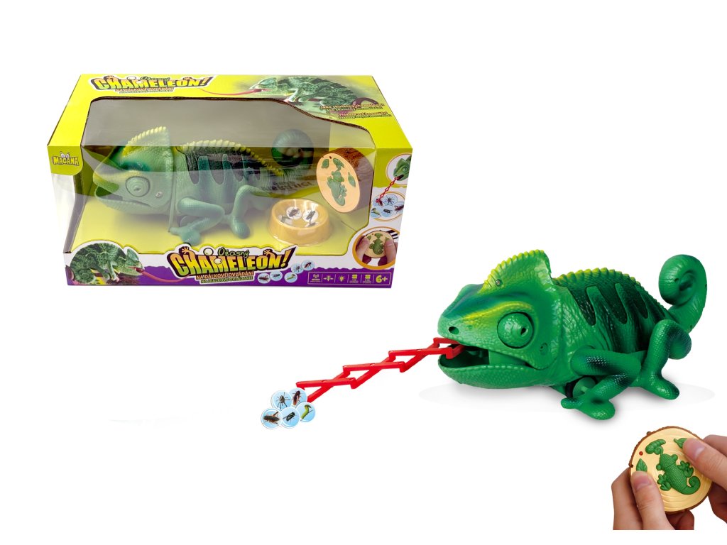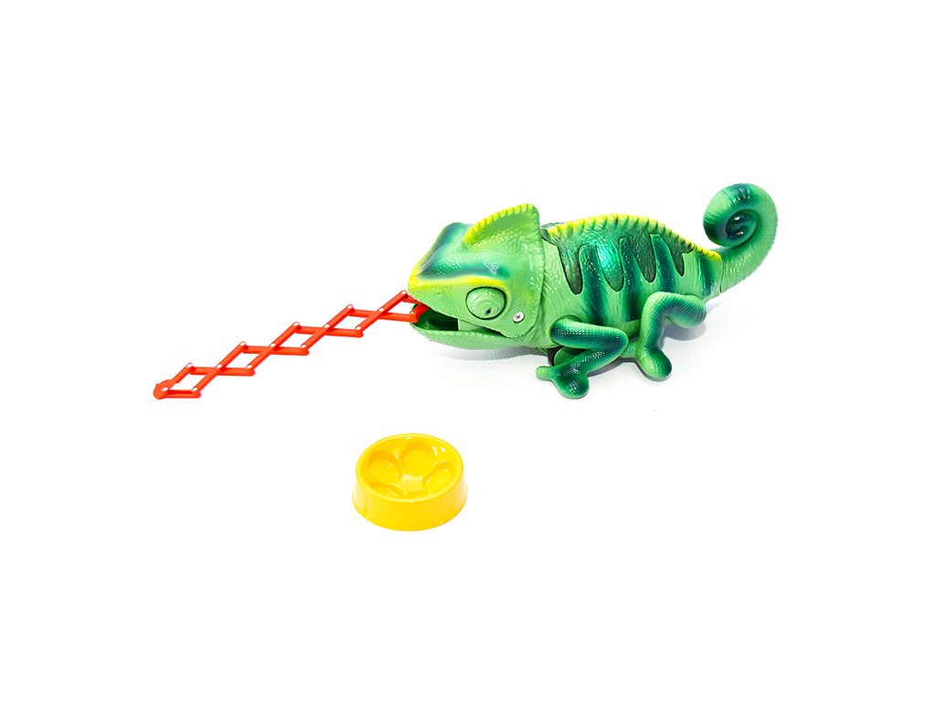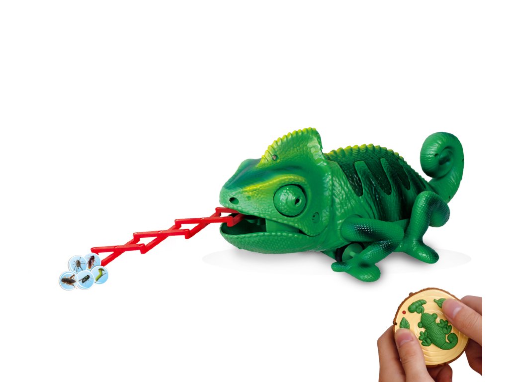 Chameleon na dálkové ovládání. Mění barvu hýbe ocasem a vystrkuje jazyk, na který chytá hmyz.