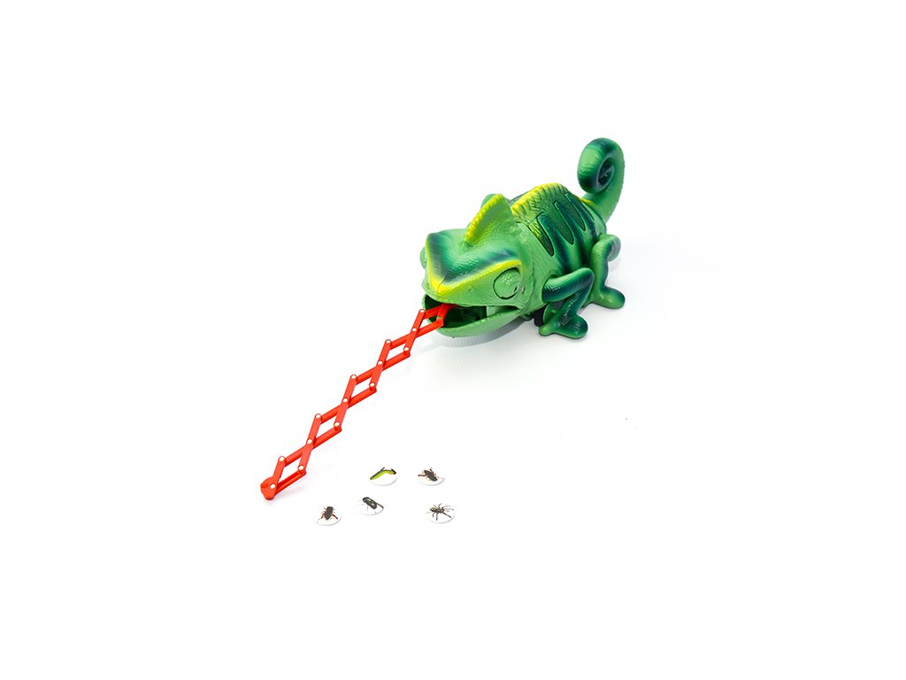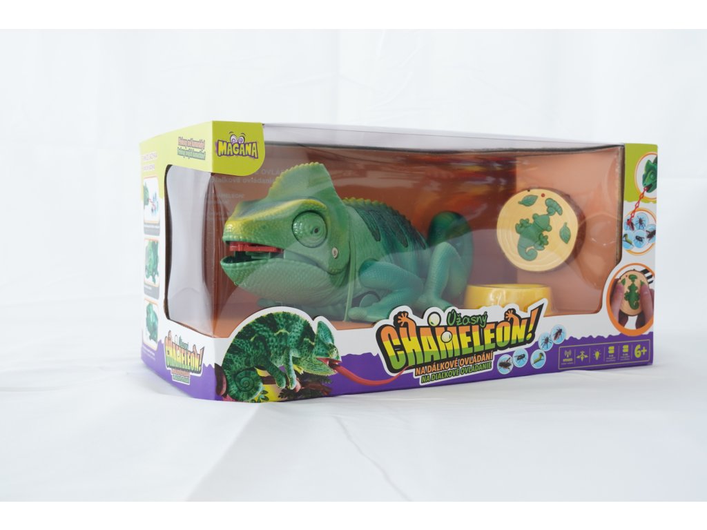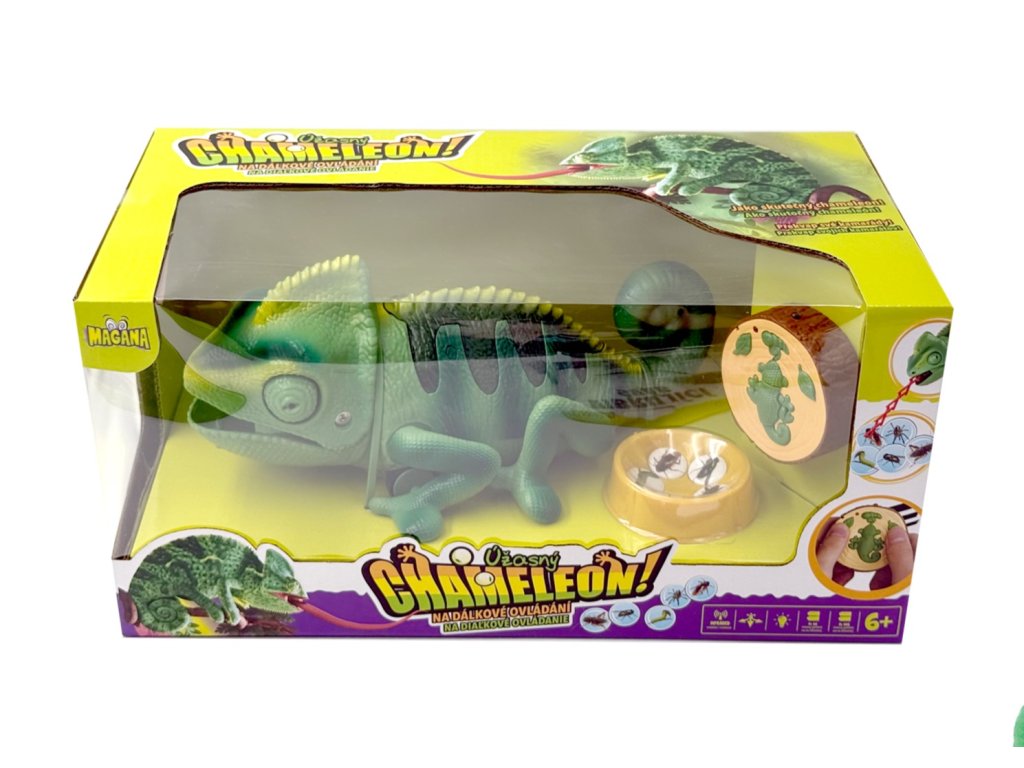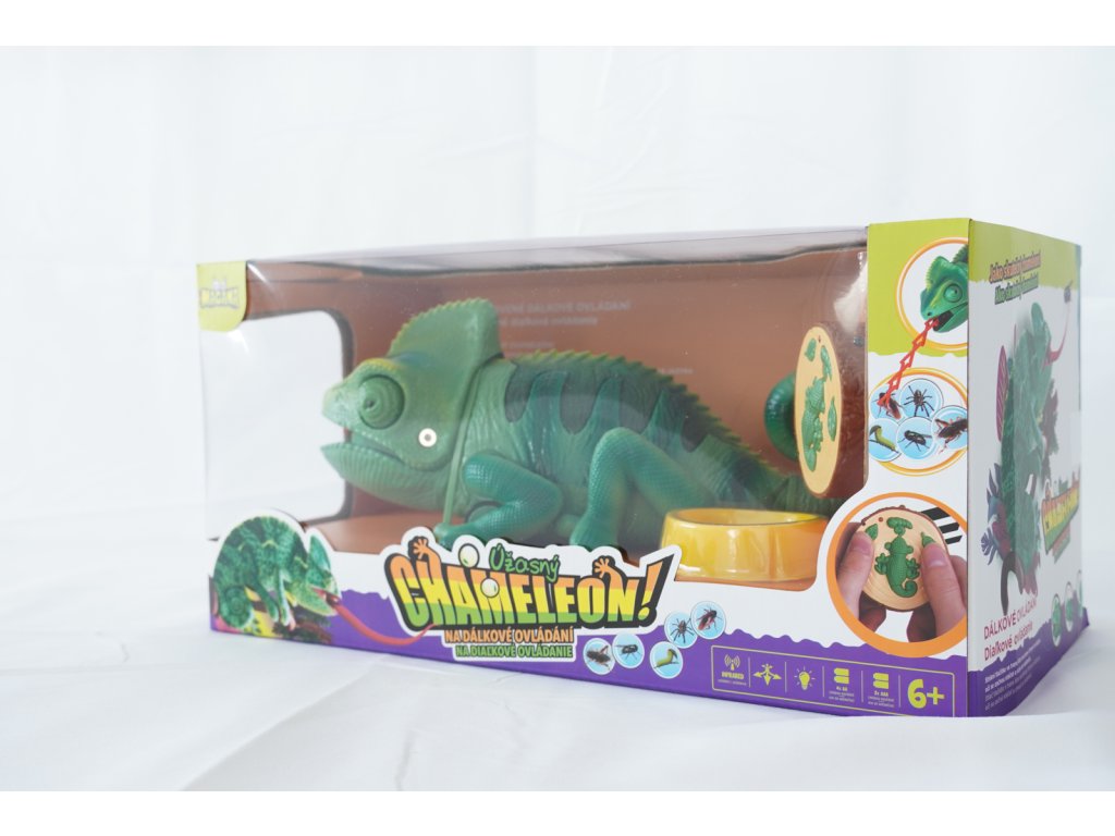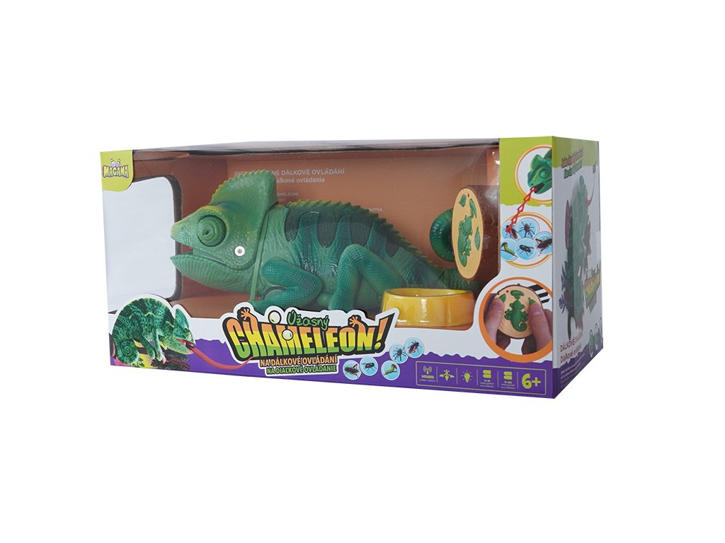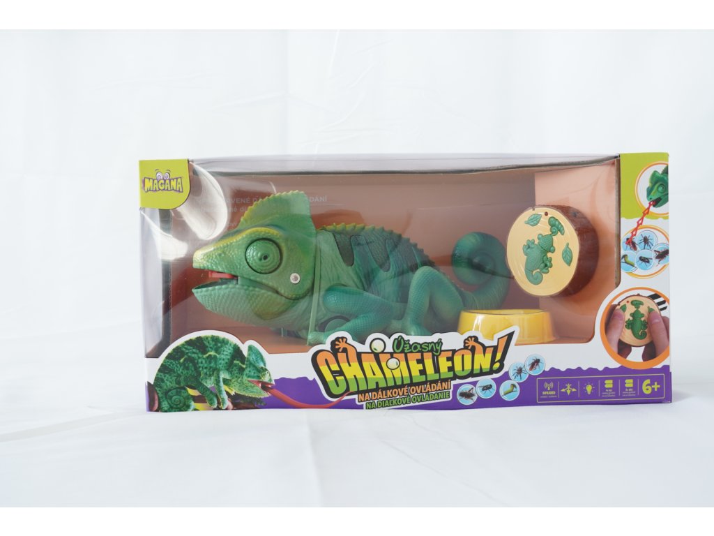 Chameleon na dálkové ovládání. Mění barvu hýbe ocasem a vystrkuje jazyk, na který chytá hmyz.