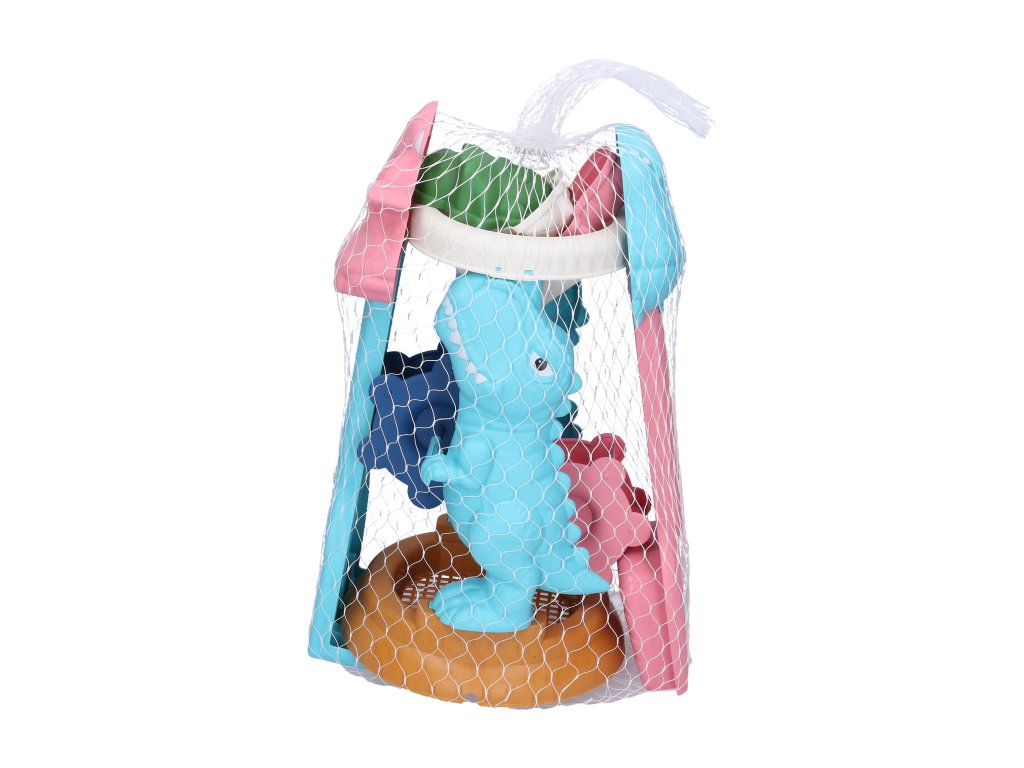 Dino plážová sada. Obsah balení - hrábě, lopatka, 3xformička, vodní mlýnek (výška 26 cm).