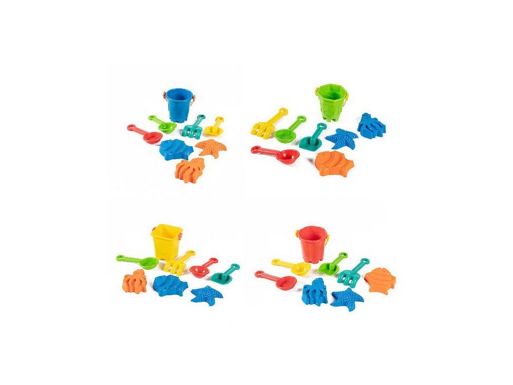 Sada na písek kyblík s nářadím a formičkami. Rozměry kyblíku 9,5x9x16 cm. Obsah balení - kyblík, 2x lopatka, sítko, hrabičky, 3x formičky. 4 varianty - modrá, zelená, žlutá, červená.