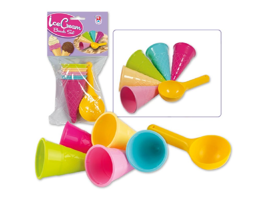 6dílná sada tvořítek na písek - zmrzlina. Vyrobeno v Itálii z kvalitních plastů. Obsahuje pět kornoutků a kopečkovač na zmrzlinu. Baleno v sáčku o rozměrech 15 x 31 cm. Váha: 0,17 kg. Váha: 0,14 kg. Doporučený věk od 12 měsíců.