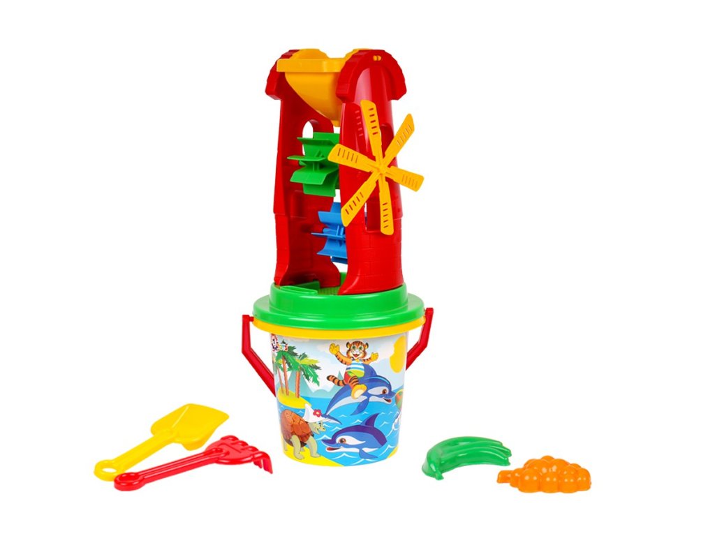 Parádní sada na písek s mlýnkem. Obsahuje kyblík 16 cm, mlýnek, lopatku, hrábě, sítko a 2 ks formiček. Barvy se mohou lišit od vyobrazení.