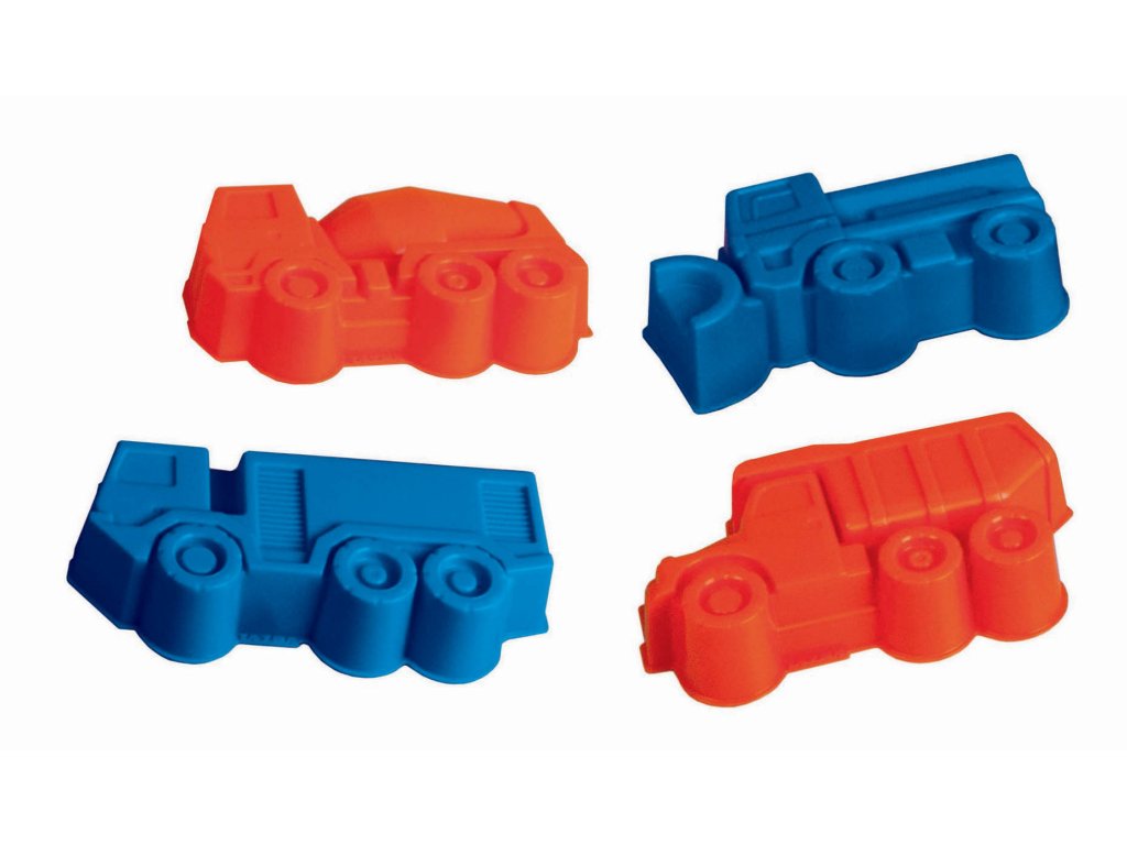 Sada 4 kusů formiček na písek by neměla chybět žádnému malému staviteli! Formičky jsou v modré a oranžové barvě a také mají různé tvary nákladních aut.
