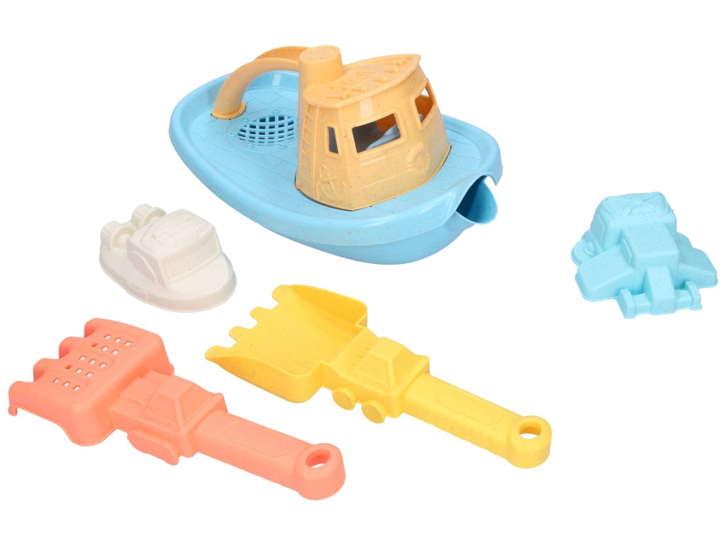 Sada na písek s lodí. Velikost lodě 22 cm. Součástí loď, lopatka, hrábě, 2 formičky.