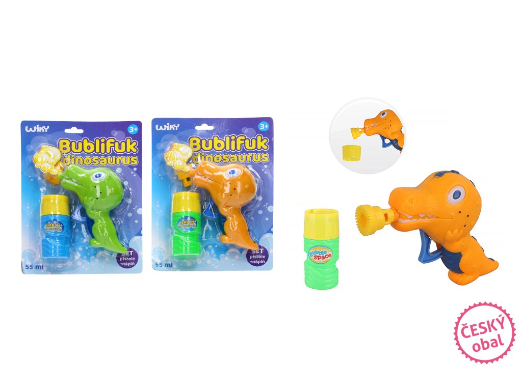 Bublifuk dinosaurus. Objem 55 ml. 2 varianty - zelená, oranžová.