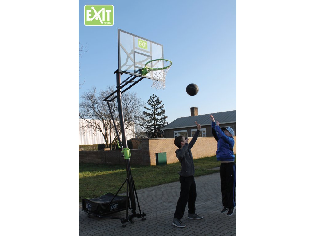 Basketbalový koš Exit Galaxy přenosný je vybaven unikátním systémem obsahujícím protizávaží. Pokud budete používat běžné pohybovací systémy, u který musíte často naklonit celý koš před tím než koš posunete, což není snadné a je to také nebezpečné, hlavně pro děti, u systému Galaxy je rám vybaven třemi kolečky a můžete tak se systémem snadno a rychle pohybovat bes naklápění celého systému. Otočné kolečko na přední straně umožňuje snadné řízení, které je ještě podpořeno čelní rukojetí pro velmi jednoduchou manipulaci i pro děti.