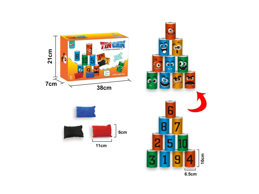 Sportovní hra házení na plechovky. Plechovky mají z jedné strany čísla a z druhé strany různé obličeje. Snaž se a shoď co nejvíce plechovek.