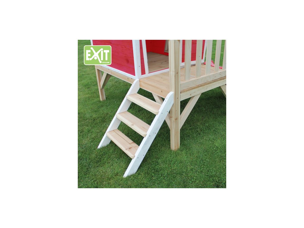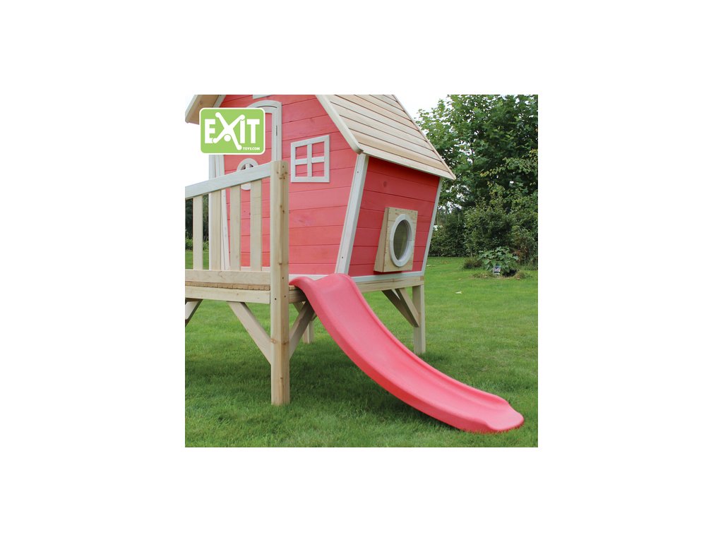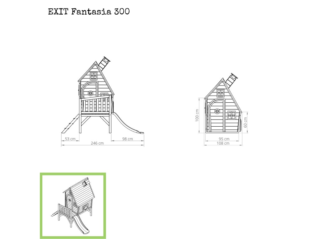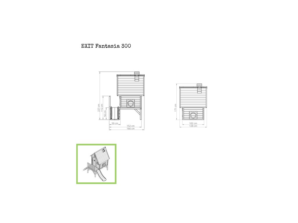 Vlastní domeček na hraní by chtělo každé dítě. Nějaké super místo na hraní společně se svými sourozenci, nebo kamarády?EXIT Fantasia 300 je právě ten nejlepší domeček! Domeček na stojnách má opravdovou verandu a malou skluzavkou lze sjet zase dolů. S veselými zelenými barvami, asymetrickými okny a dveřmi a dokonce i se střešními okny je tento nápaditý dětský domeček snem pro každé dítě od 3 let. Domečky jsou ze suchého cedrového dřeva. Je to zvláštní dřevina, protože již od přírody odolává povětrnostním vlivům, vlhkosti a také trouchnivění. Cedrové dřevo není ošetřeno nezdravými chemikáliemi, jako je to často u např. borovicového nebo smrkového dřeva. Cedrové dřevo je také šetrné k životnímu prostředí a bezpečné pro děti. Stavební prvky jsou již nabarveny vodoodpudivým mořidlem. Domečky odpovídají aktuelním bezpečnostním požadavkům (EN-71), a tak je zajištěno bezpečné potěšení ze hry. Navíc tato dřevina není ošetřena nezdravými chemikáliemi a má tu příjemnou vlastnost, že se nerozpadá. Domečky jsou sestaveny z předmontovaných stavebních prvků, dokonce i okna a dveře jsou předmontovaná. Tedy opravdový předvyrobený systém. Stavební prvky jsou pro Vás již předvrtané, a tak je domeček možné v mžiku sestavit. Domečky se montojí dle podrobných návodů. Součástí jsou šrouby a veškeré doplňky potřebné k montáži.Montáž je velmi jednoduchá, protože domeček je montovaný s velkých sesazených dílů, střecha, bočnice, podlaha a pod.. Domečky nádherně voní, i dlouho po montáži na zahradě. Cedrové dřevo je vysoce kvalitní voňavé dřevo s velkou tolerancí k výkyvům teplot. Umístěte na suché, rovné místo, aby dřevo nehnilo a domeček mohl rovně stát.