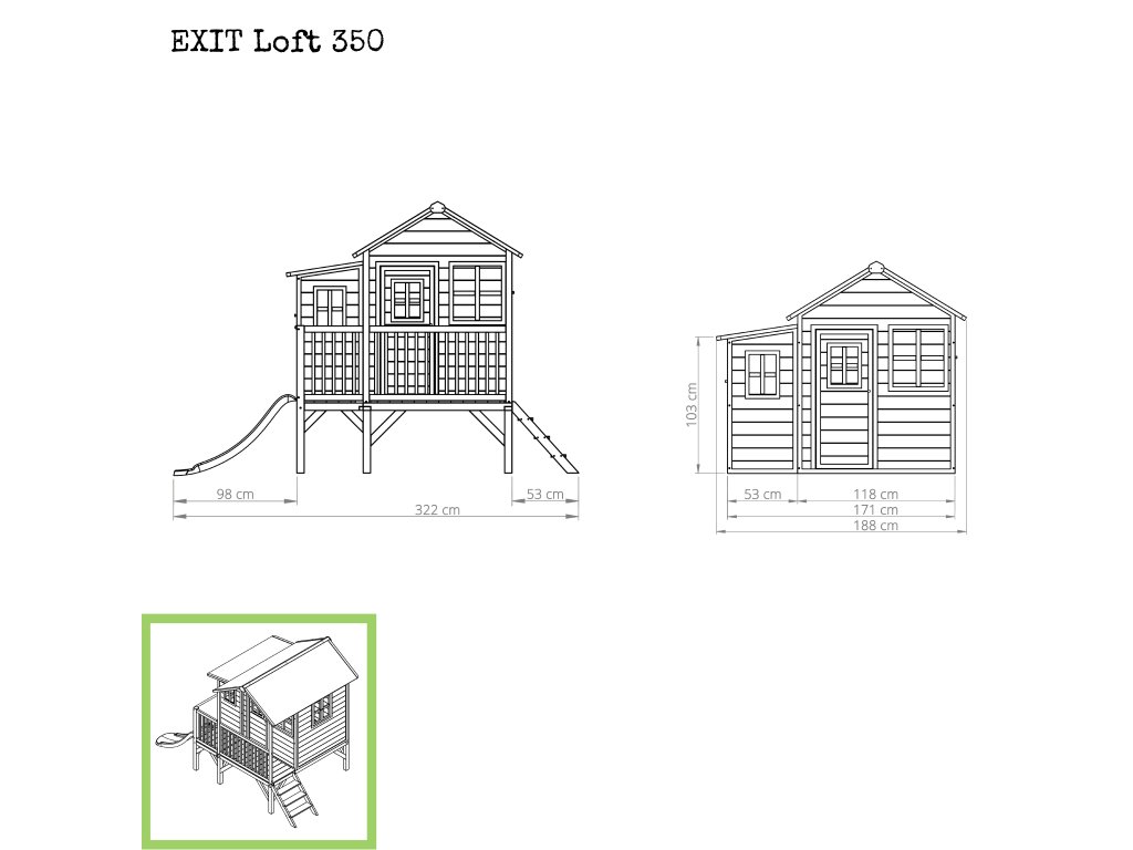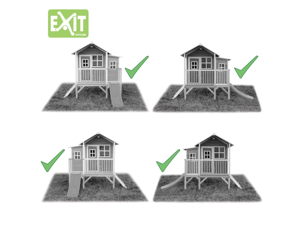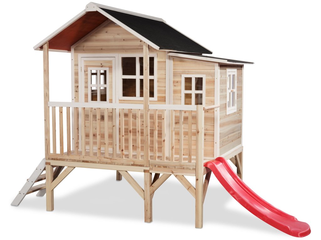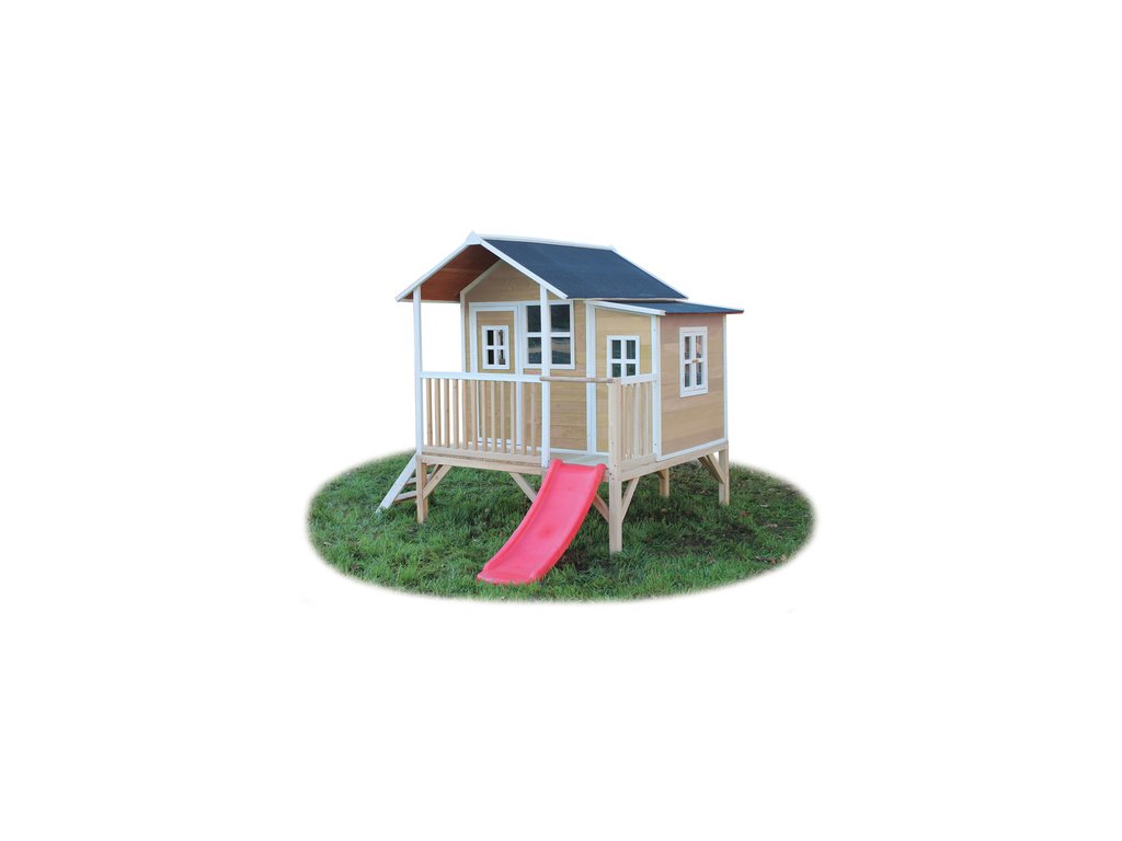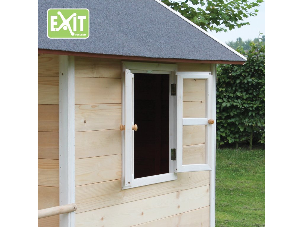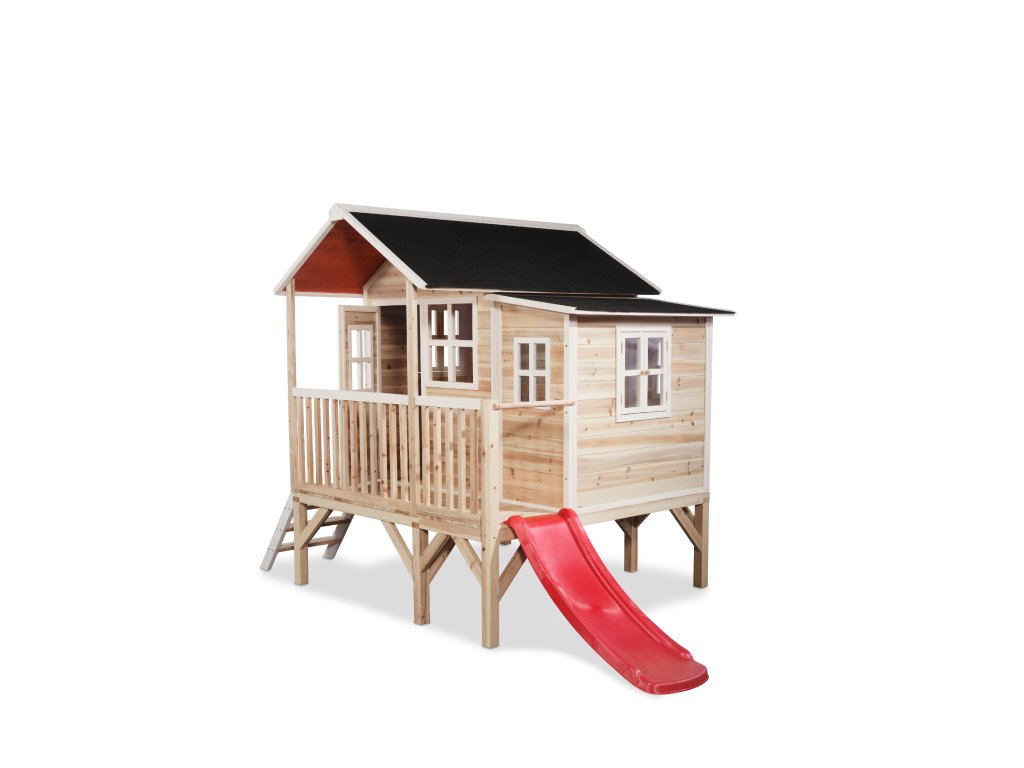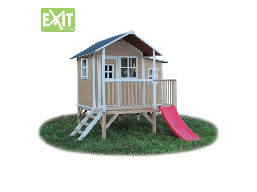Domeček na hraní by chtělo každé dítě. Nějaké super místo na hraní společně se svými sourozenci, nebo kamarády? EXIT Loft 350 je právě takový domeček. S rozměry 2m x 2,8m je obrovským domečkem s celkovou výškou 2,25m a výškou podesty 56cm, kde si nádherně může hrát více dětí. A protože střecha je vodotěsná, je vevnitř vždy sucho. Domeček na stojnách má opravdovou verandu a malou skluzavkou lez sjet zpátky dolů. S veselými okny je tento nápaditý dětský domeček snem pro každé dítě od 3 let. Domečky jsou ze suchého cedrového dřeva. Je to zvláštní dřevina, protože již od přírody odolává povětrnostním vlivům, vlhkosti a také trouchnivění. Cedrové dřevo není ošetřeno nezdravými chemikáliemi, jako je to často u např. borovicového nebo smrkového dřeva. Cedrové dřevo je také šetrné k životnímu prostředí a bezpečné pro děti. Stavební prvky jsou již nabarveny vodoodpudivým mořidlem. Domečky odpovídají aktuálním bezpečnostním požadavkům (EN-71), a tak je zajištěno bezpečné potěšení ze hry. Navíc tato dřevina není ošetřena nezdravými chemikáliemi a má tu příjemnou vlastnost, že se nerozpadá. Domečky jsou sestaveny z předmontovaných stavebních prvků, dokonce i okna a dveře jsou předmontovaná. Tedy opravdový předvyrobený systém. Stavební prvky jsou pro Vás již předvrtané, a tak je domeček možné v mžiku sestavit.
