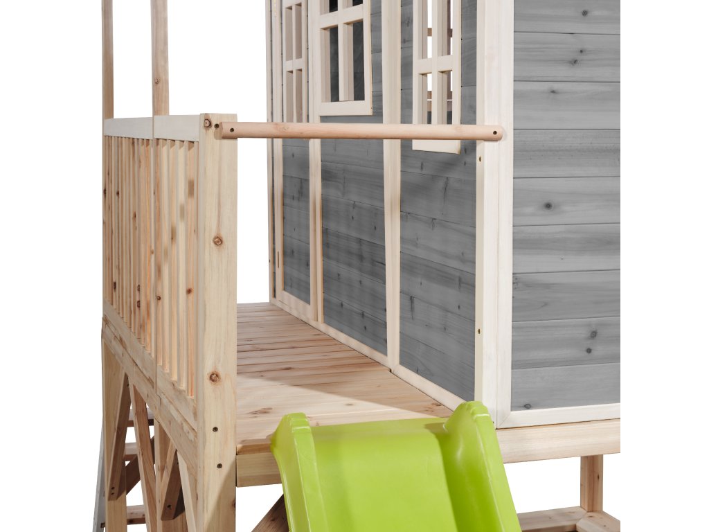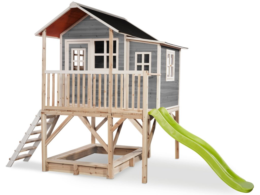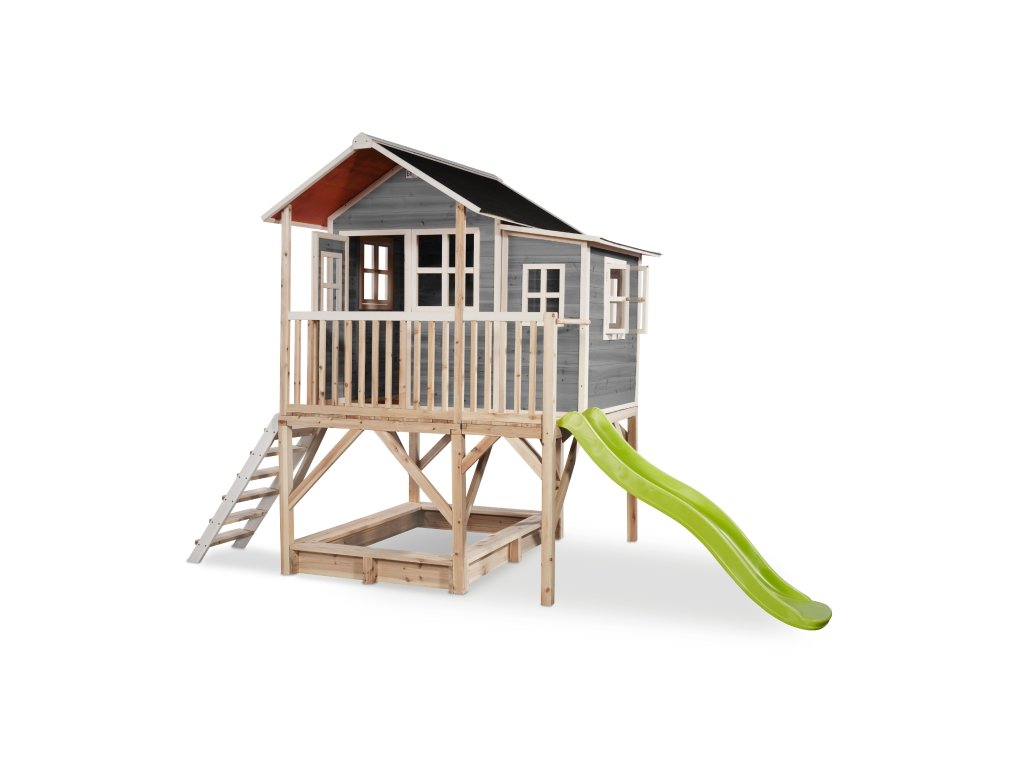 Vlastní domeček na hraní by chtělo každé dítě. Nějaké super místo na hraní společně se svými sourozenci, nebo kamarády? EXIT Loft 550 je právě takový domeček pro mladé i staré ! S rozměry 3,48 m x 2,2 m výškou 2,55m je obrovským domečkem, kde si nádherně může hrát více dětí. A protože střecha je vodotěsná, je vevnitř vždy sucho. Domeček na stojnách má opravdovou verandu a malou skluzavkou lez sjet zpátky dolů. Ti nejmladší si mohou hrát dole na pískovišti, zatímco ti starší si hrají nahoře v domečku. S veselými okny je tento nápaditý dětský domeček snem pro každé dítě od 3 let. Domečky jsou ze suchého cedrového dřeva. Je to zvláštní dřevina, protože již od přírody odolává povětrnostním vlivům, vlhkosti a také trouchnivění. Cedrové dřevo není ošetřeno nezdravými chemikáliemi, jako je to často u např. borovicového nebo smrkového dřeva. Cedrové dřevo je také šetrné k životnímu prostředí a bezpečné pro děti. Stavební prvky jsou již nabarveny vodoodpudivým mořidlem. Domečky odpovídají aktuálním bezpečnostním požadavkům (EN-71), a tak je zajištěno bezpečné potěšení ze hry. Navíc tato dřevina není ošetřena nezdravými chemikáliemi a má tu příjemnou vlastnost, že se nerozpadá. Domečky jsou sestaveny z předmontovaných stavebních prvků, dokonce i okna a dveře jsou předmontovaná. Tedy opravdový předvyrobený systém. Stavební prvky jsou pro Vás již předvrtané, a tak je domeček možné v mžiku sestavit.