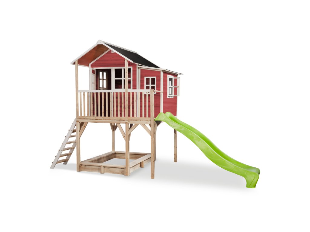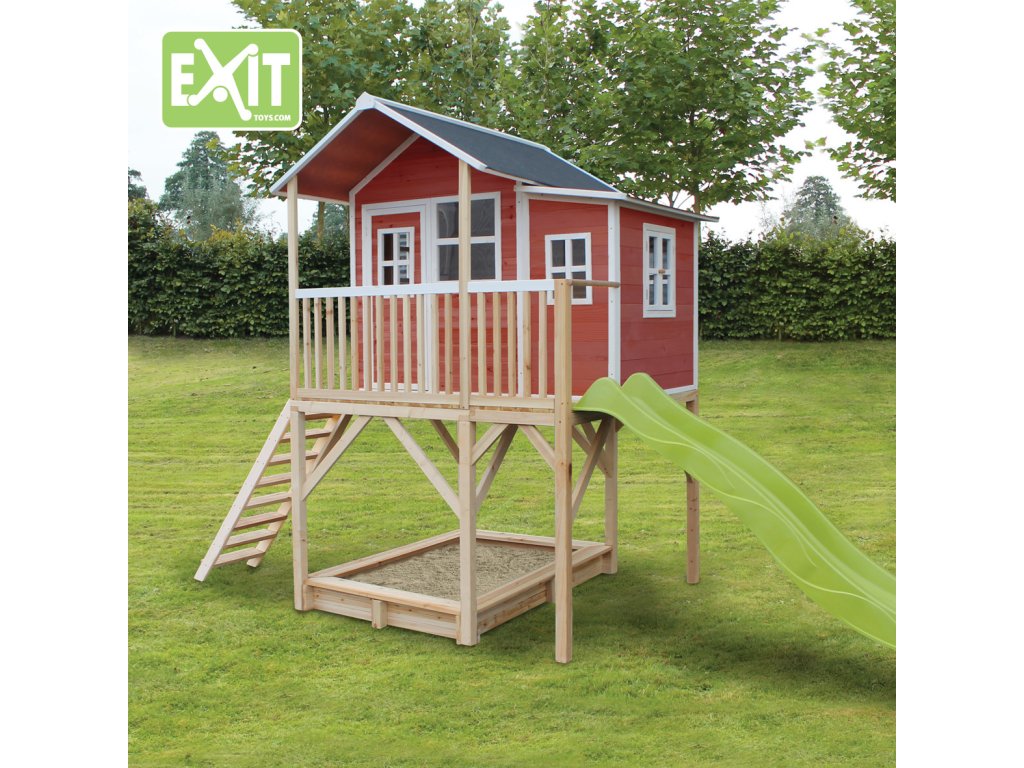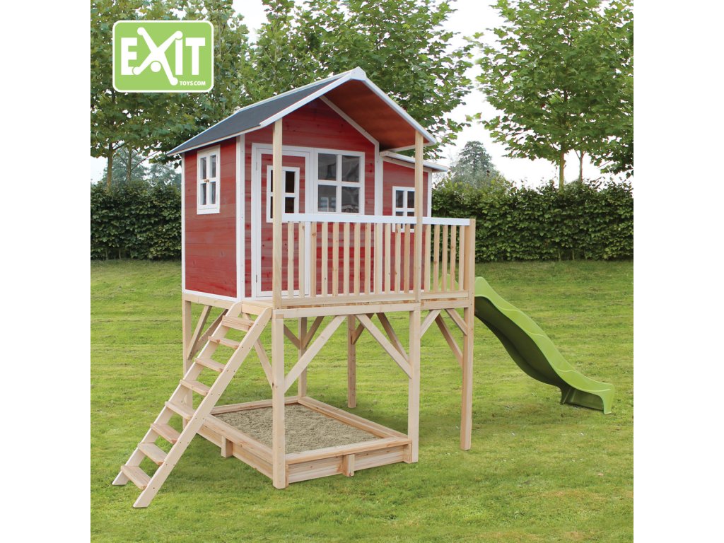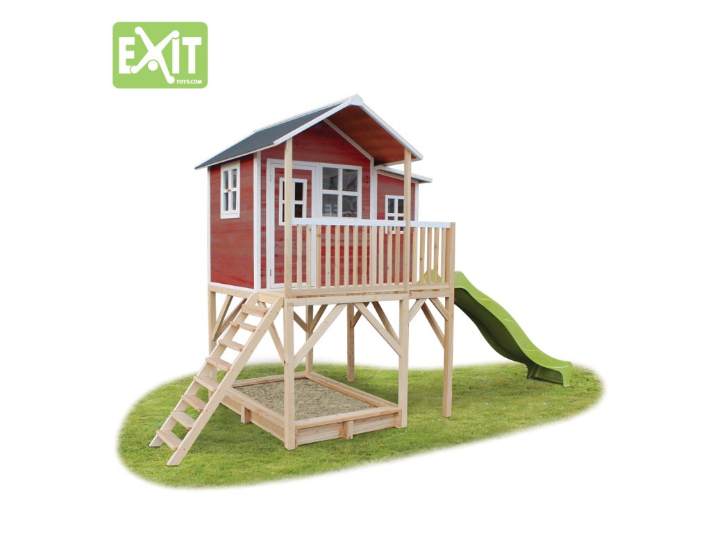 Vlastní domeček na hraní by chtělo každé dítě. Nějaké super místo na hraní společně se svými sourozenci, nebo kamarády? EXIT Loft 750 je právě takový domeček pro mladé i staré ! Domeček Loft 750 má hlavní výhodu, že má podestu ve výšce 120cm což umožňuje že si děti mohou jednoduše hrát pod domečkem v pískovišti. Domeček je rozšířen o půlmetru což, zajistí větší prostor uvnitř. A protože střecha je vodotěsná, je vevnitř vždy sucho. Domeček na stojnách má opravdovou verandu a velkou skluzavkou o délce 2,4m. Ti nejmladší si mohou hrát dole na pískovišti, zatímco ti starší si hrají nahoře v domečku. S veselými plexisklovými okny je tento nápaditý dětský domeček snem pro každé dítě od 3 let.Domečky jsou ze suchého cedrového dřeva. Je to zvláštní dřevina, protože již od přírody odolává povětrnostním vlivům, vlhkosti a také trouchnivění. Cedrové dřevo není ošetřeno nezdravými chemikáliemi, jako je to často u např. borovicového nebo smrkového dřeva. Cedrové dřevo je také šetrné k životnímu prostředí a bezpečné pro děti. Stavební prvky jsou již nabarveny vodoodpudivým mořidlem. Domečky odpovídají aktualním bezpečnostním požadavkům (EN-71), a tak je zajištěno bezpečné potěšení ze hry. Navíc tato dřevina není ošetřena nezdravými chemikáliemi a má tu příjemnou vlastnost, že se nerozpadá. Domečky jsou sestaveny z předmontovaných stavebních prvků, dokonce i okna a dveře jsou předmontovaná. Tedy opravdový předvyrobený systém. Stavební prvky jsou pro Vás již předvrtané, a tak je domeček možné v mžiku sestavit.