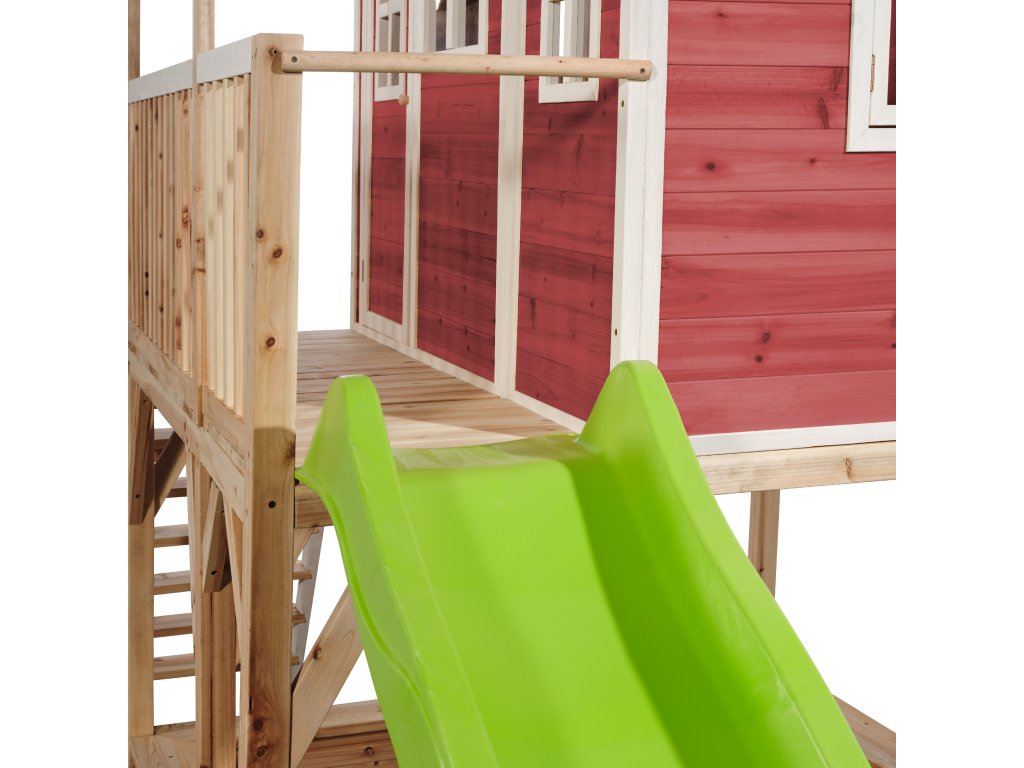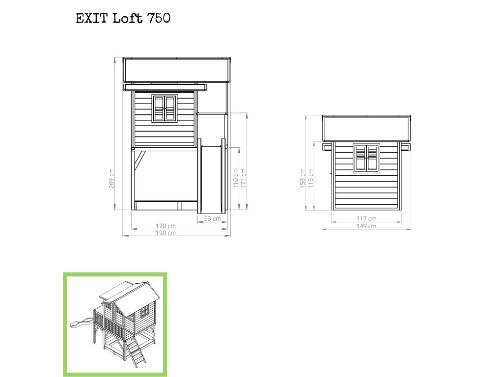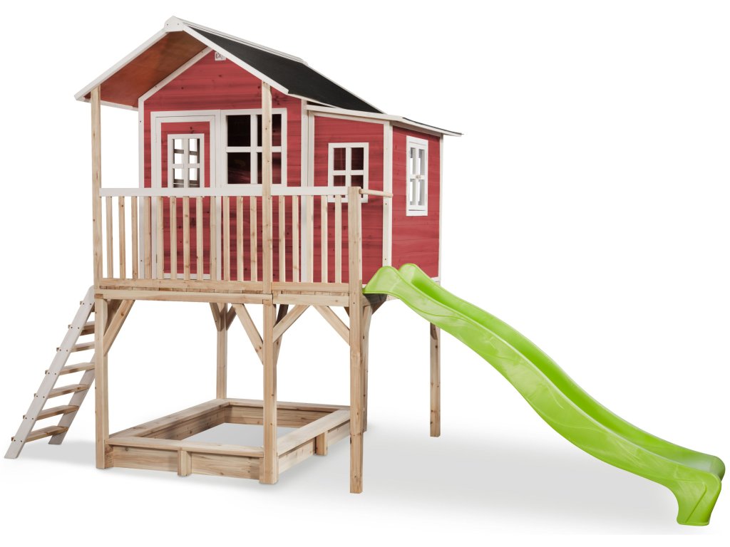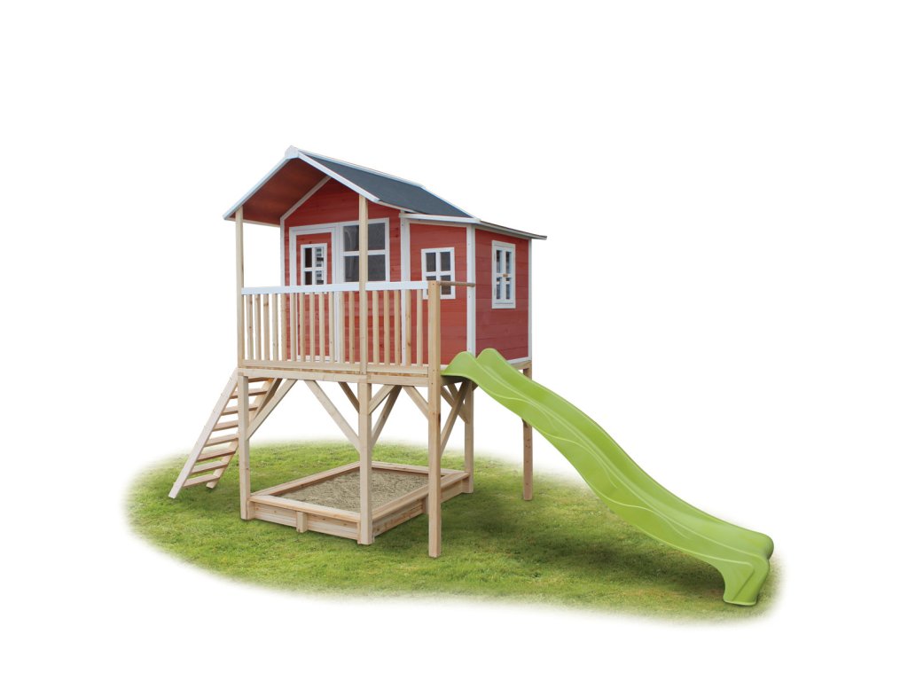Vlastní domeček na hraní by chtělo každé dítě. Nějaké super místo na hraní společně se svými sourozenci, nebo kamarády? EXIT Loft 750 je právě takový domeček pro mladé i staré ! Domeček Loft 750 má hlavní výhodu, že má podestu ve výšce 120cm což umožňuje že si děti mohou jednoduše hrát pod domečkem v pískovišti. Domeček je rozšířen o půlmetru což, zajistí větší prostor uvnitř. A protože střecha je vodotěsná, je vevnitř vždy sucho. Domeček na stojnách má opravdovou verandu a velkou skluzavkou o délce 2,4m. Ti nejmladší si mohou hrát dole na pískovišti, zatímco ti starší si hrají nahoře v domečku. S veselými plexisklovými okny je tento nápaditý dětský domeček snem pro každé dítě od 3 let.Domečky jsou ze suchého cedrového dřeva. Je to zvláštní dřevina, protože již od přírody odolává povětrnostním vlivům, vlhkosti a také trouchnivění. Cedrové dřevo není ošetřeno nezdravými chemikáliemi, jako je to často u např. borovicového nebo smrkového dřeva. Cedrové dřevo je také šetrné k životnímu prostředí a bezpečné pro děti. Stavební prvky jsou již nabarveny vodoodpudivým mořidlem. Domečky odpovídají aktualním bezpečnostním požadavkům (EN-71), a tak je zajištěno bezpečné potěšení ze hry. Navíc tato dřevina není ošetřena nezdravými chemikáliemi a má tu příjemnou vlastnost, že se nerozpadá. Domečky jsou sestaveny z předmontovaných stavebních prvků, dokonce i okna a dveře jsou předmontovaná. Tedy opravdový předvyrobený systém. Stavební prvky jsou pro Vás již předvrtané, a tak je domeček možné v mžiku sestavit.