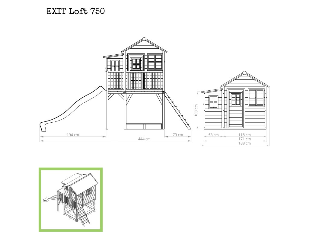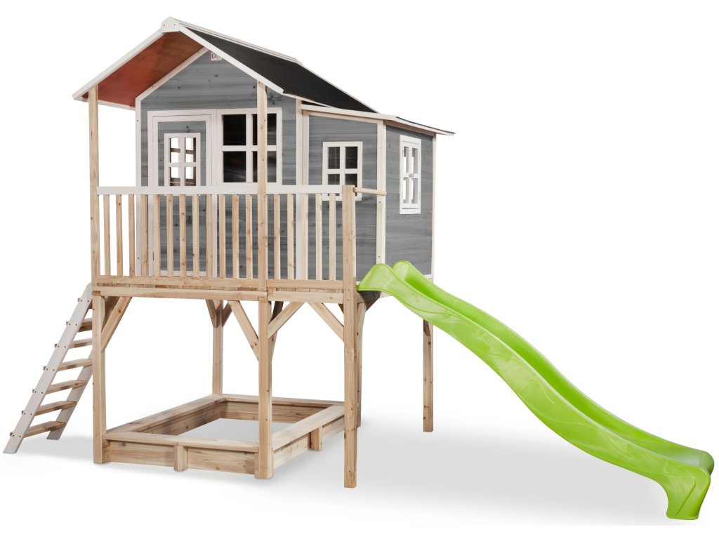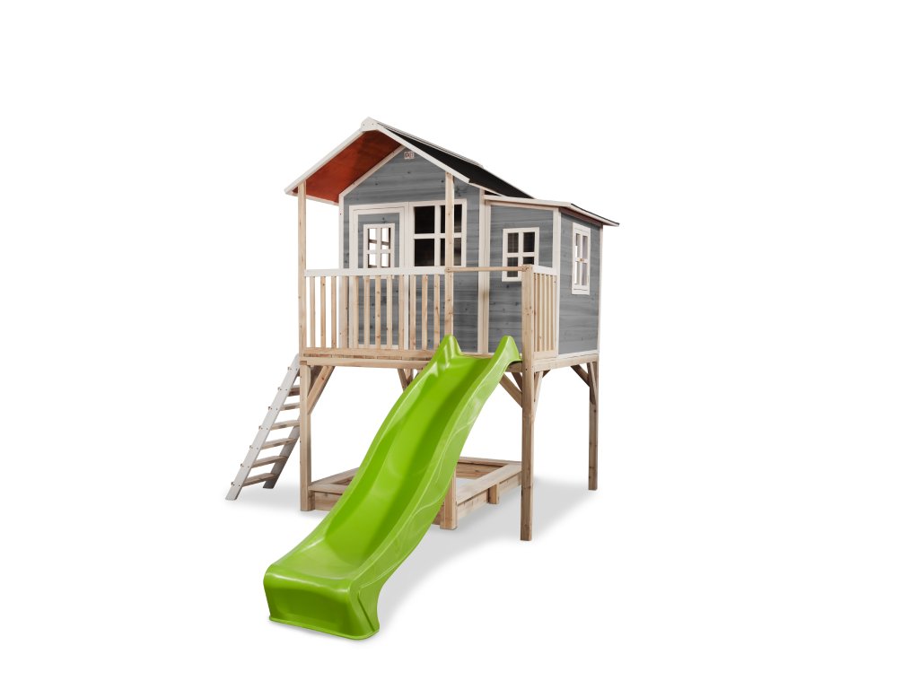 Vlastní domeček na hraní by chtělo každé dítě. Nějaké super místo na hraní společně se svými sourozenci, nebo kamarády? EXIT Loft 750 je právě takový domeček pro mladé i staré ! Domeček Loft 750 má hlavní výhodu, že má podestu ve výšce 120cm což umožňuje že si děti mohou jednoduše hrát pod domečkem v pískovišti. Domeček je rozšířen o půlmetru což, zajistí větší prostor uvnitř. A protože střecha je vodotěsná, je vevnitř vždy sucho. Domeček na stojnách má opravdovou verandu a velkou skluzavkou o délce 2,4m. Ti nejmladší si mohou hrát dole na pískovišti, zatímco ti starší si hrají nahoře v domečku. S veselými plexisklovými okny je tento nápaditý dětský domeček snem pro každé dítě od 3 let.Domečky jsou ze suchého cedrového dřeva. Je to zvláštní dřevina, protože již od přírody odolává povětrnostním vlivům, vlhkosti a také trouchnivění. Cedrové dřevo není ošetřeno nezdravými chemikáliemi, jako je to často u např. borovicového nebo smrkového dřeva. Cedrové dřevo je také šetrné k životnímu prostředí a bezpečné pro děti. Stavební prvky jsou již nabarveny vodoodpudivým mořidlem. Domečky odpovídají aktualním bezpečnostním požadavkům (EN-71), a tak je zajištěno bezpečné potěšení ze hry. Navíc tato dřevina není ošetřena nezdravými chemikáliemi a má tu příjemnou vlastnost, že se nerozpadá. Domečky jsou sestaveny z předmontovaných stavebních prvků, dokonce i okna a dveře jsou předmontovaná. Tedy opravdový předvyrobený systém. Stavební prvky jsou pro Vás již předvrtané, a tak je domeček možné v mžiku sestavit.