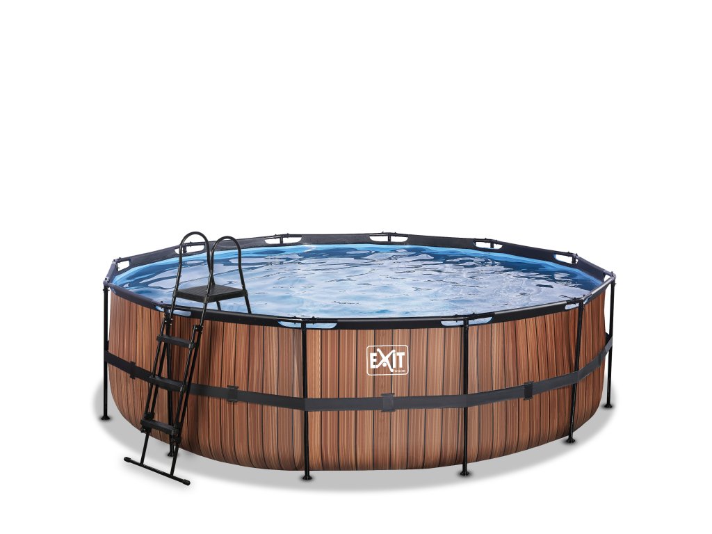 Kamenný, nebo dřevěný vzor bazénu s černou konstrukcí se hodí do každé zahrady. Vnitřní část bazénu je modrá. Pevnost bazénu zajišťují třívrstvé stěny z PVC a polyesteru. Filtrační čerpadlo udržuje vodu čerstvou a pohyblivou, aby se zabránilo znečištění.
