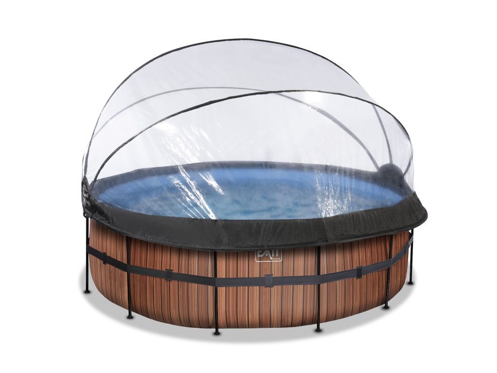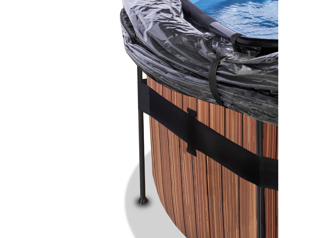 Kamenný, nebo dřevěný vzor bazénu s černou konstrukcí se hodí do každé zahrady. Vnitřní část bazénu je modrá. Pevnost bazénu zajišťují třívrstvé stěny z PVC a polyesteru. Filtrační čerpadlo udržuje vodu čerstvou a pohyblivou, aby se zabránilo znečištění.