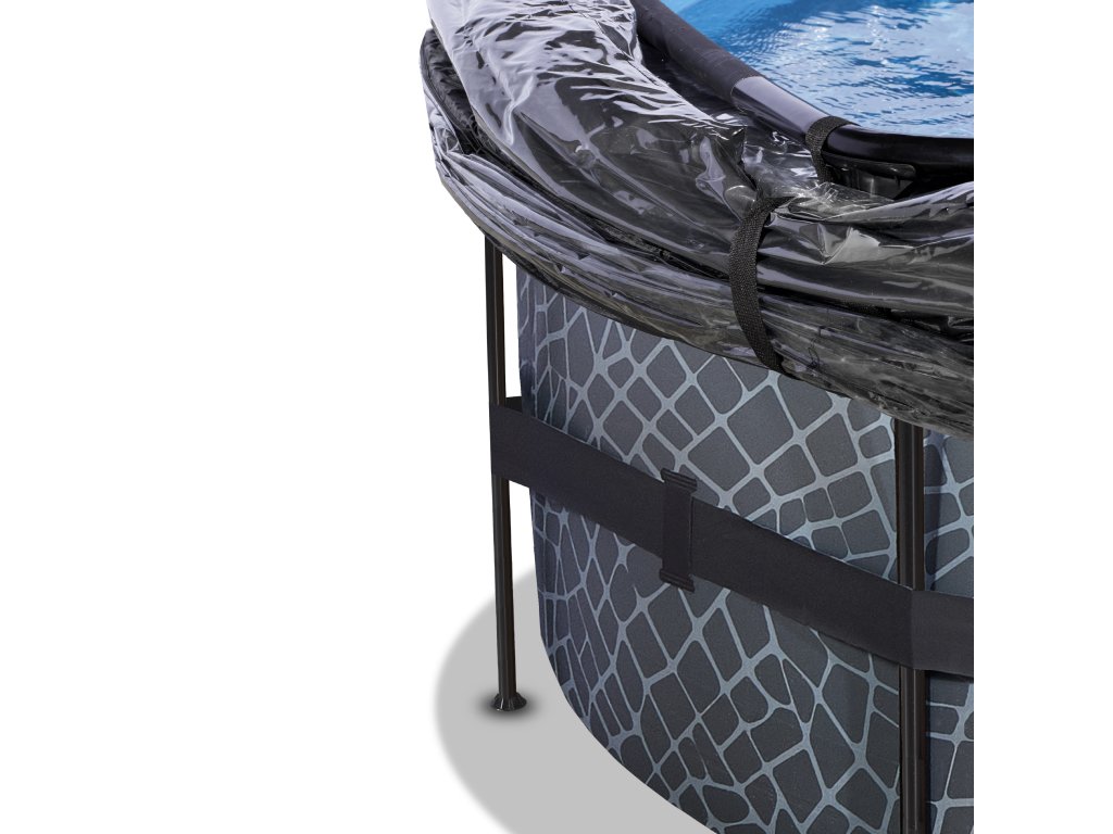Kamenný, nebo dřevěný vzor bazénu s černou konstrukcí se hodí do každé zahrady. Vnitřní část bazénu je modrá. Pevnost bazénu zajišťují třívrstvé stěny z PVC a polyesteru. Filtrační čerpadlo udržuje vodu čerstvou a pohyblivou, aby se zabránilo znečištění.